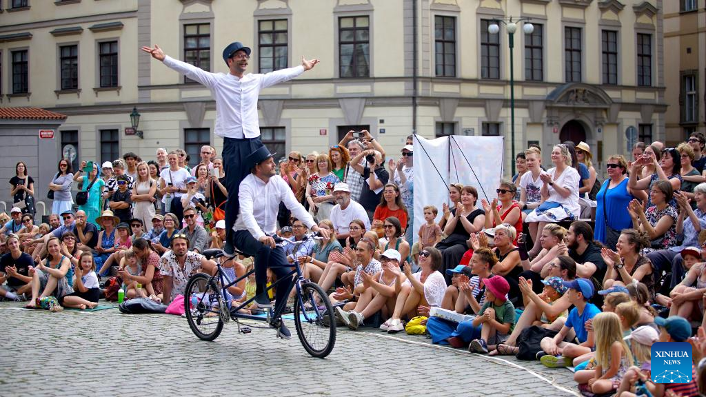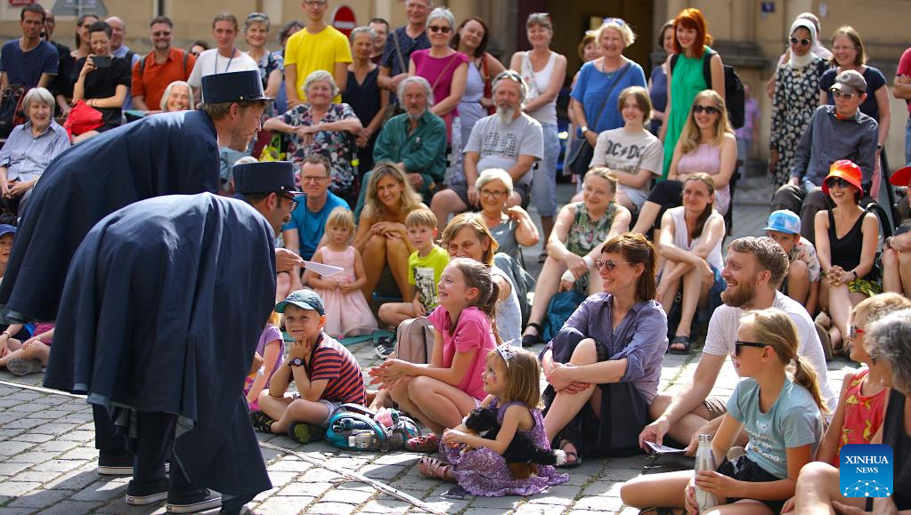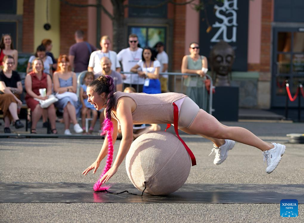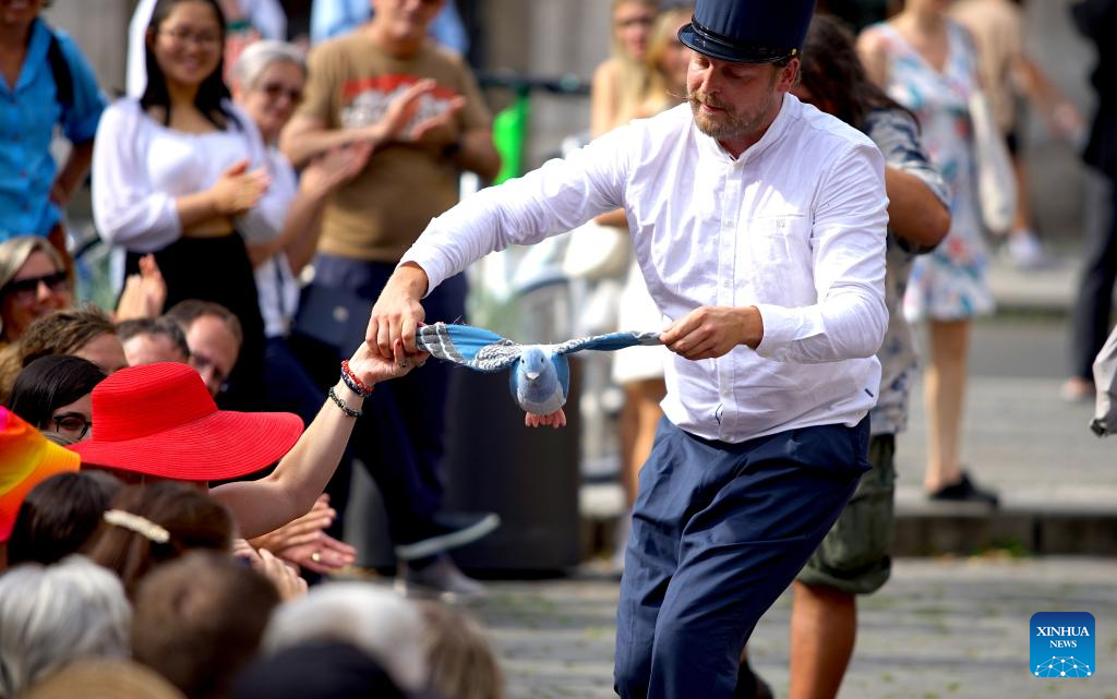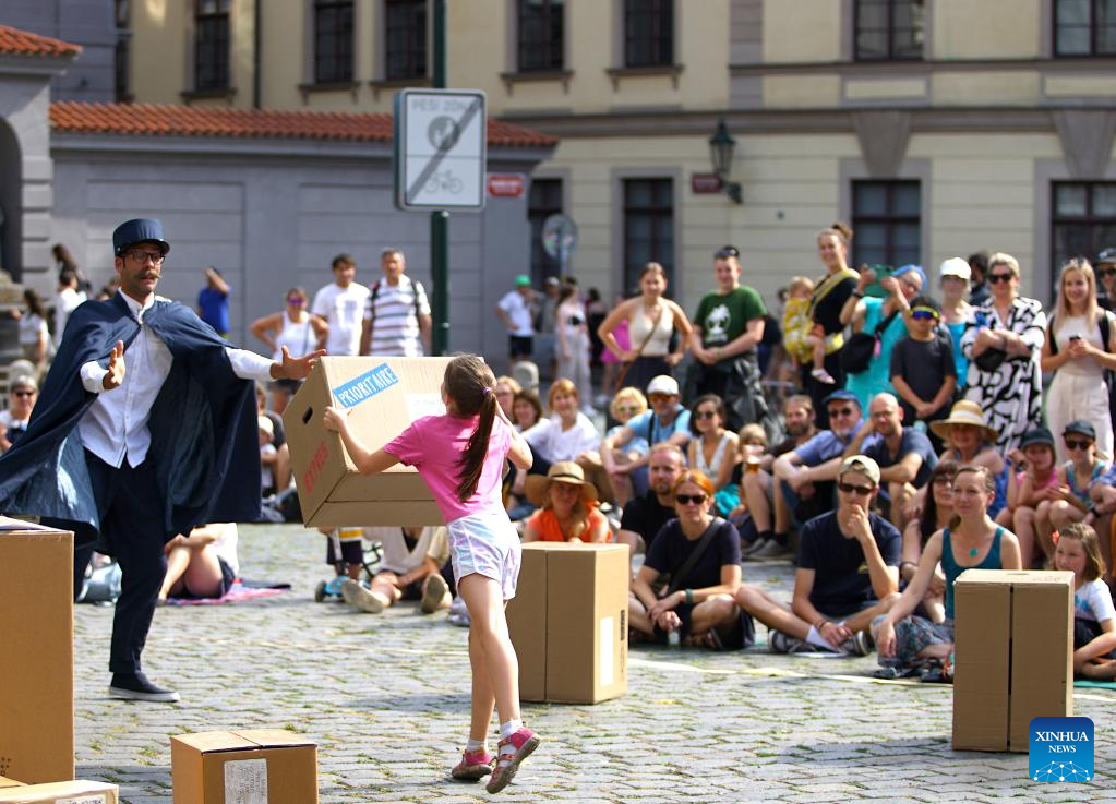 An artist performs during the 15th International Street Theatre Festival in Prague, the Czech Republic, July 14, 2023. The week-long festival, which sees performances by artists from several countries, will last till July 18 in the Czech capital. (Photo by Dana Kesnerova/Xinhua)
