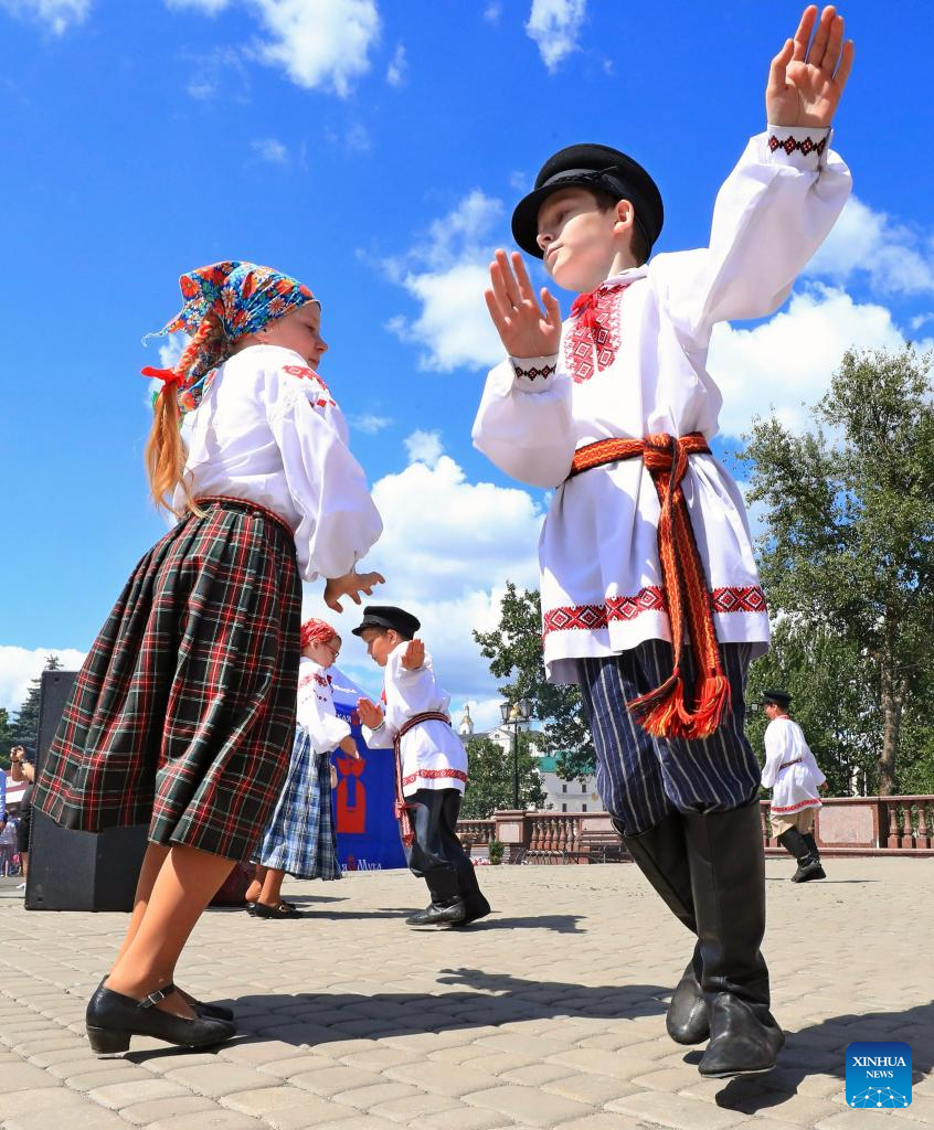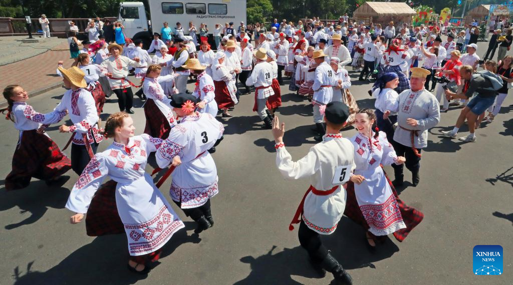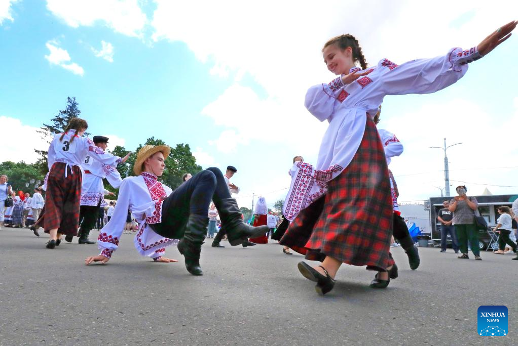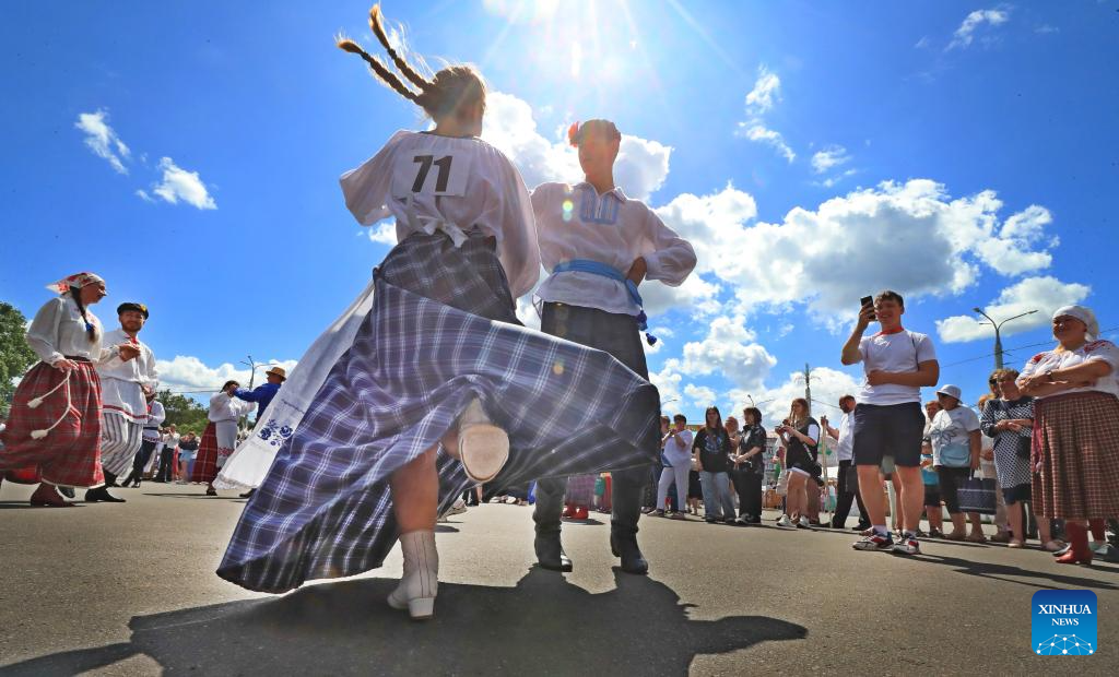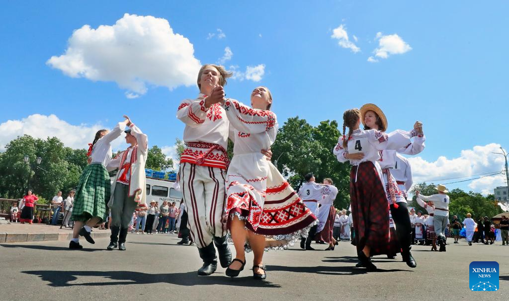 People dance during a folk dance competition in Vitebsk, Belarus, July 15, 2023. A folk dance competition was held here during the 32nd International Festival of Arts "Slavianski Bazaar". (Photo by Henadz Zhinkov/Xinhua)