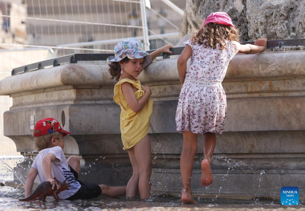 Children cool themselves at a fountain of Three Graces on the Place de Comedie as the highest temperature reaches 38 degrees centigrade in Montpellier, southern France, July 19, 2023. Extreme heat warnings were issued across Europe on Wednesday as the best part of the continent was gripped by the most intense heatwave since records began. (Xinhua/Gao Jing)