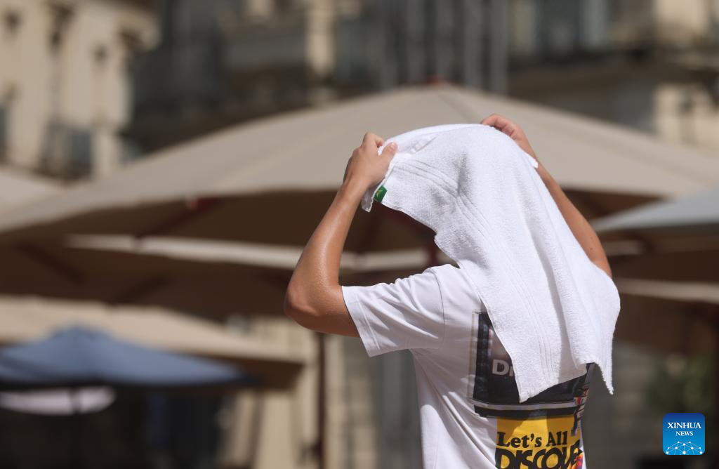 A man covers himself with a towel as the highest temperature reaches 38 degrees centigrade in Montpellier, southern France, July 19, 2023. Extreme heat warnings were issued across Europe on Wednesday as the best part of the continent was gripped by the most intense heatwave since records began. (Xinhua/Gao Jing)
