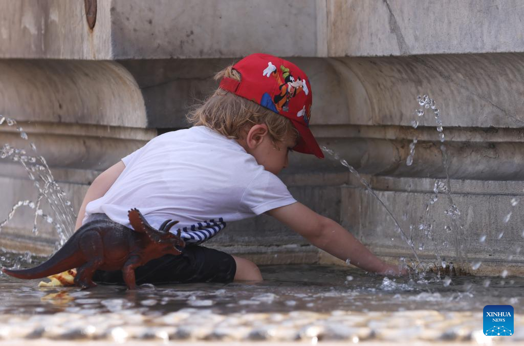 A boy cools himself at a fountain in Montpellier, southern France, July 18, 2023. Extreme heat warnings were issued across Europe on Wednesday as the best part of the continent was gripped by the most intense heatwave since records began. (Xinhua/Gao Jing)