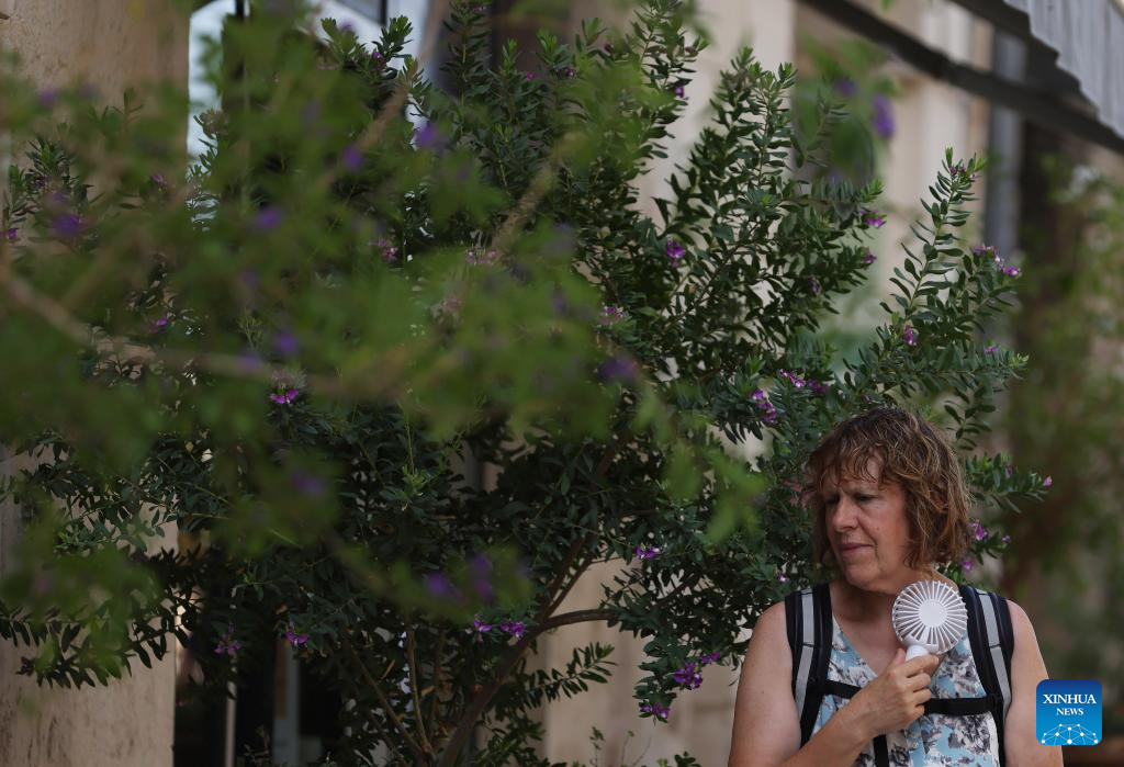 A woman cools herself with a mini-fan as the highest temperature reaches 38 degrees centigrade in Montpellier, southern France, July 19, 2023. Extreme heat warnings were issued across Europe on Wednesday as the best part of the continent was gripped by the most intense heatwave since records began. (Xinhua/Gao Jing)