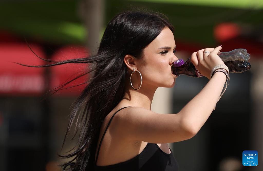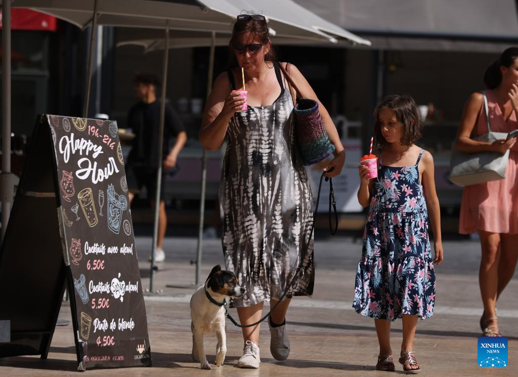 A woman drinks a beverage to cool herself while walking on the Place de Comedie as the highest temperature reaches 38 degrees centigrade in Montpellier, southern France, July 19, 2023. Extreme heat warnings were issued across Europe on Wednesday as the best part of the continent was gripped by the most intense heatwave since records began. (Xinhua/Gao Jing)