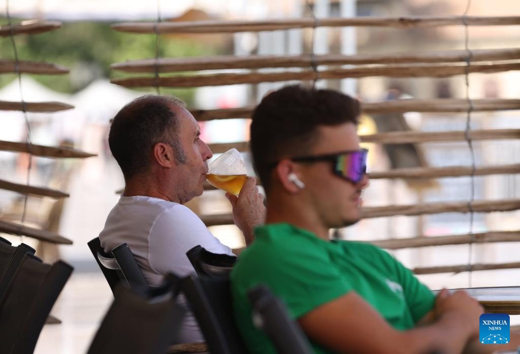 People rest at a bar as the highest temperature reaches 38 degrees centigrade in Montpellier, southern France, July 19, 2023. Extreme heat warnings were issued across Europe on Wednesday as the best part of the continent was gripped by the most intense heatwave since records began. (Xinhua/Gao Jing)