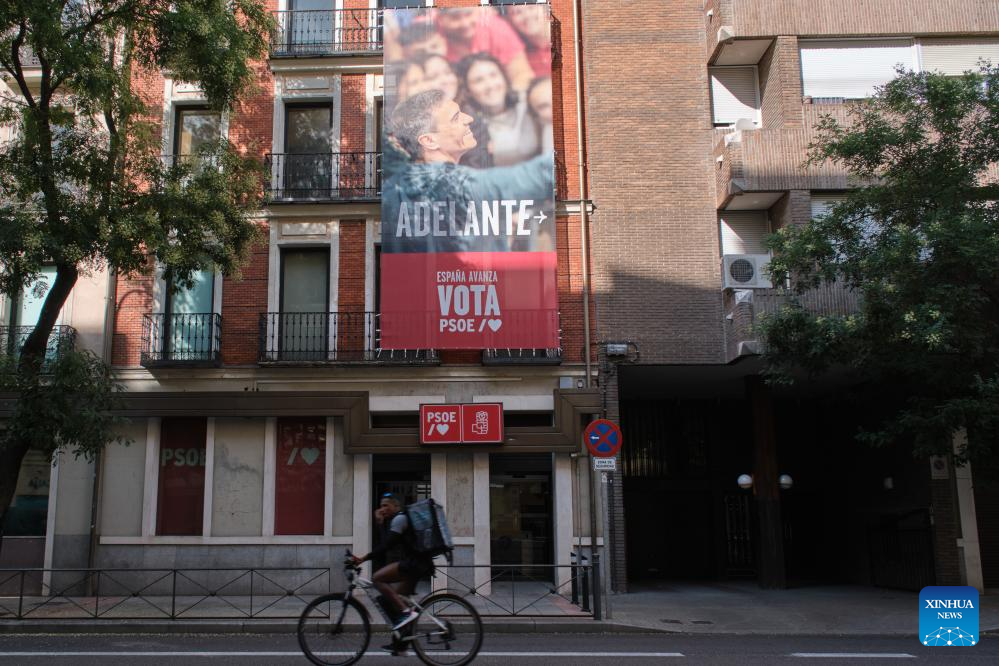 This photo taken on July 21, 2023 shows an advertising of Prime Minister Pedro Sanchez, the candidate of Spanish Socialist Workers' Party (PSOE), at the headquarters of PSOE in Madrid, Spain. Spaniards will go to the polls on Sunday in an atypical general election that determines the country's political future for the next four years. (Xinhua/Meng Dingbo)