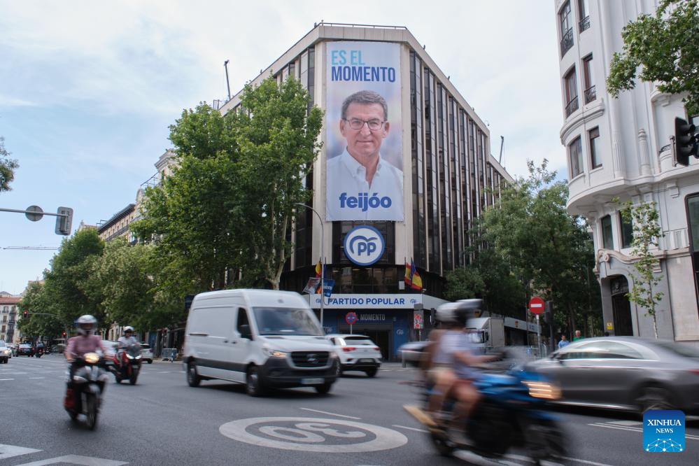 This photo taken on July 21, 2023 shows an advertising of Alberto Nunez Feijoo, the candidate of People's Party (PP), at headquarter of PP in Madrid, Spain. Spaniards will go to the polls on Sunday in an atypical general election that determines the country's political future for the next four years. (Xinhua/Meng Dingbo)