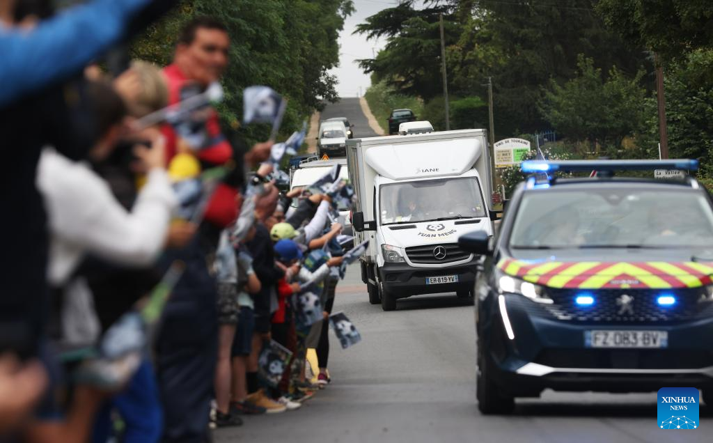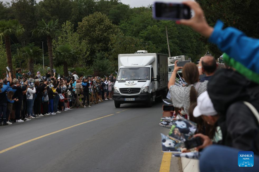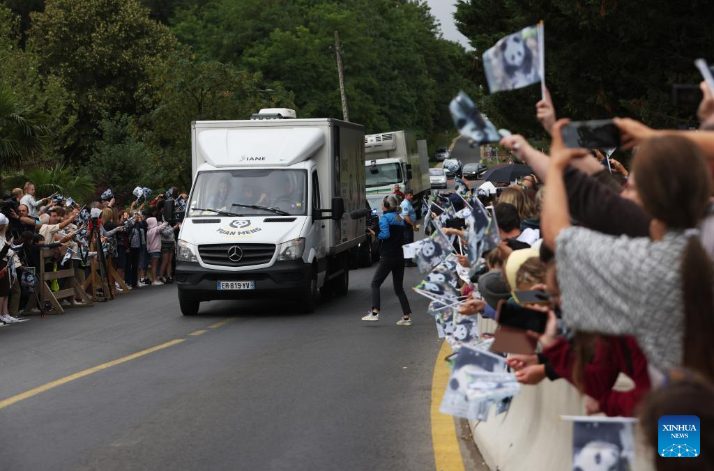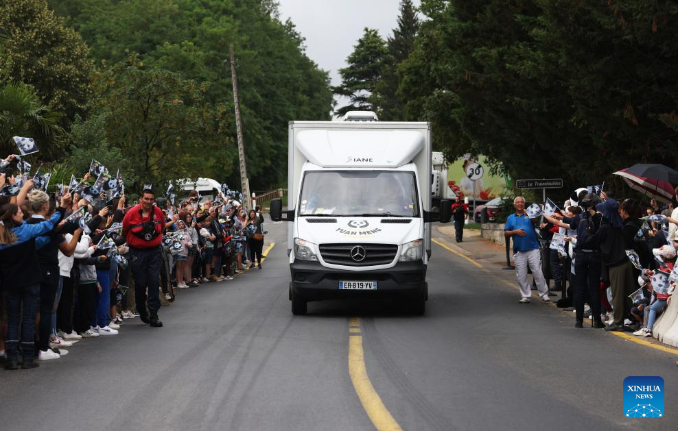 People bid farewell to giant panda Yuan Meng (in the van) in front of the Beauval Zoo in Saint-Aignan, France, July 25, 2023. First giant panda born in France Yuan Meng settled into a customized cage filled with bamboo, starting his journey to China's Chengdu Research Base of Giant Panda Breeding Tuesday after a long-haul departure from Paris. (Xinhua/Gao Jing)