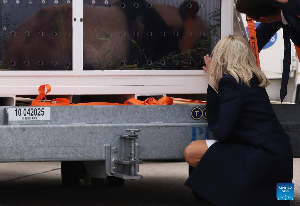 Brigitte Macron, wife of French President Emmanuel Macron, bids farewell to giant panda Yuan Meng at the Roissy Charles-de-Gaulle airport, near Paris, France, July 25, 2023. First giant panda born in France Yuan Meng settled into a customized cage filled with bamboo, starting his journey to China's Chengdu Research Base of Giant Panda Breeding Tuesday after a long-haul departure from Paris. (Xinhua/Gao Jing)