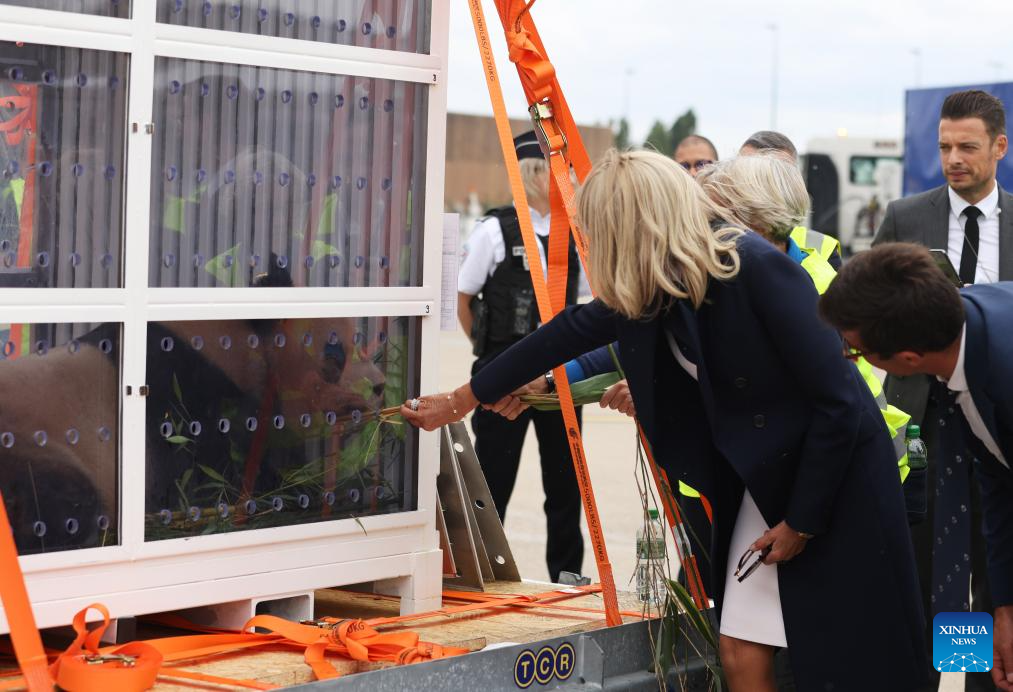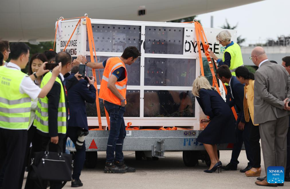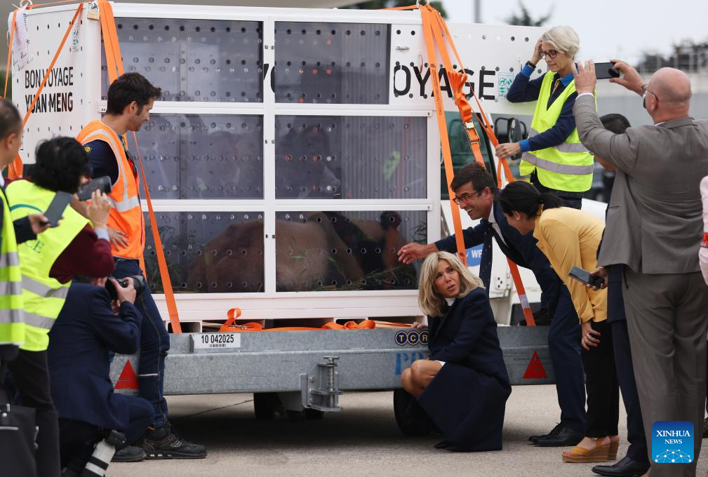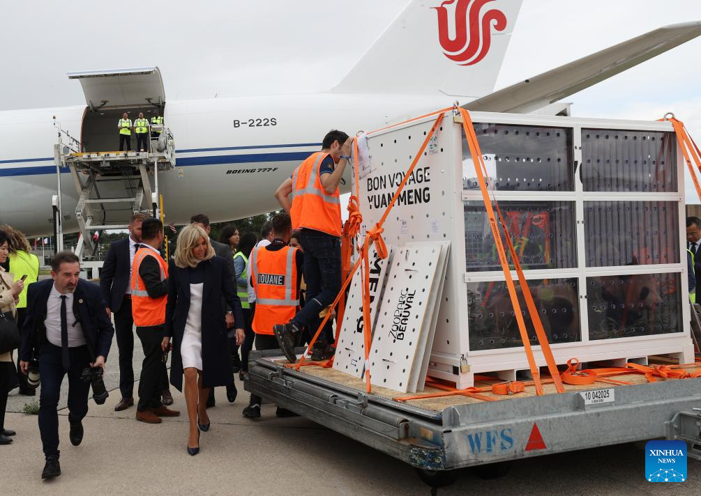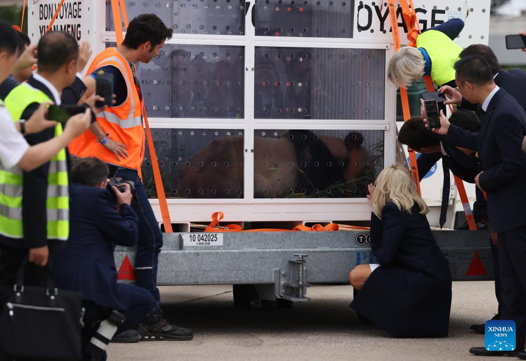 PARIS, July 26 (Xinhua) -- First giant panda born in France Yuan Meng settled into a customized cage filled with bamboo, starting his journey to China's Chengdu Research Base of Giant Panda Breeding Tuesday after a long-haul departure from Paris. Brigitte Macron, the wife of French President Emmanuel Macron, saw him off at the airport.