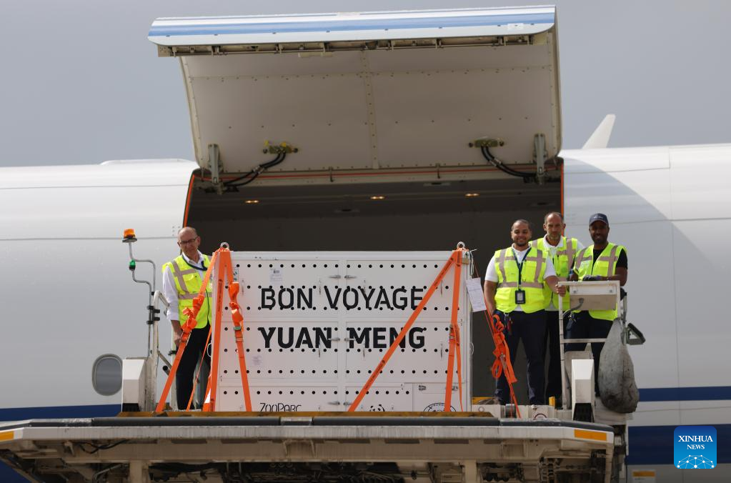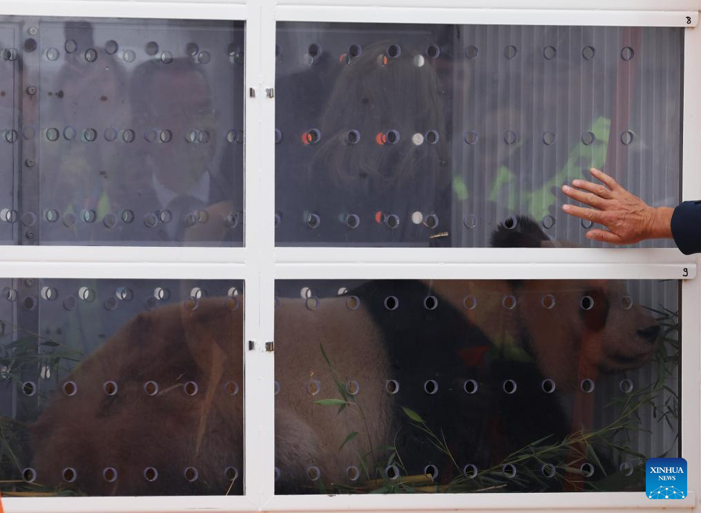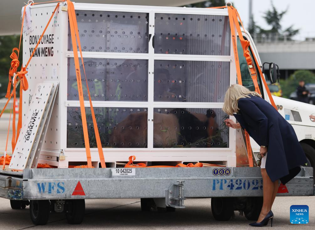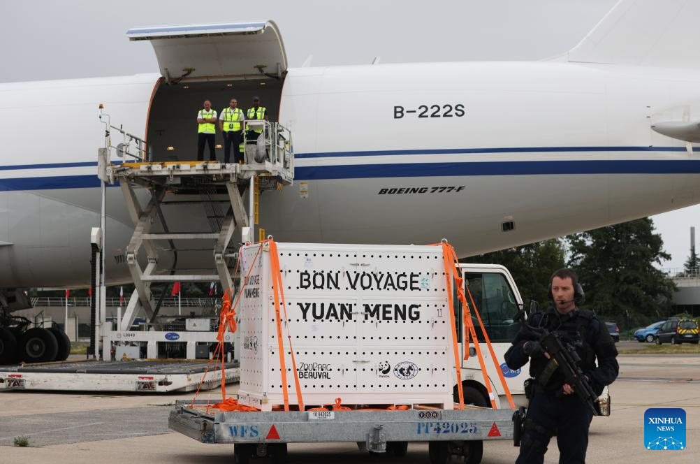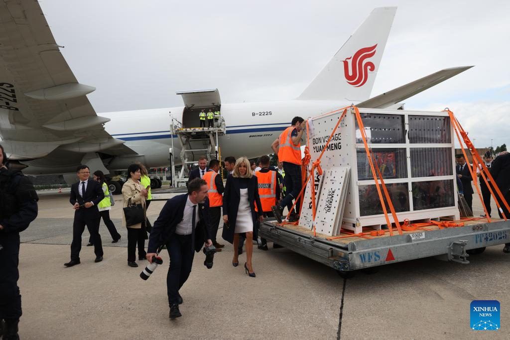 PARIS, July 26 (Xinhua) -- First giant panda born in France Yuan Meng settled into a customized cage filled with bamboo, starting his journey to China's Chengdu Research Base of Giant Panda Breeding Tuesday after a long-haul departure from Paris. Brigitte Macron, the wife of French President Emmanuel Macron, saw him off at the airport.