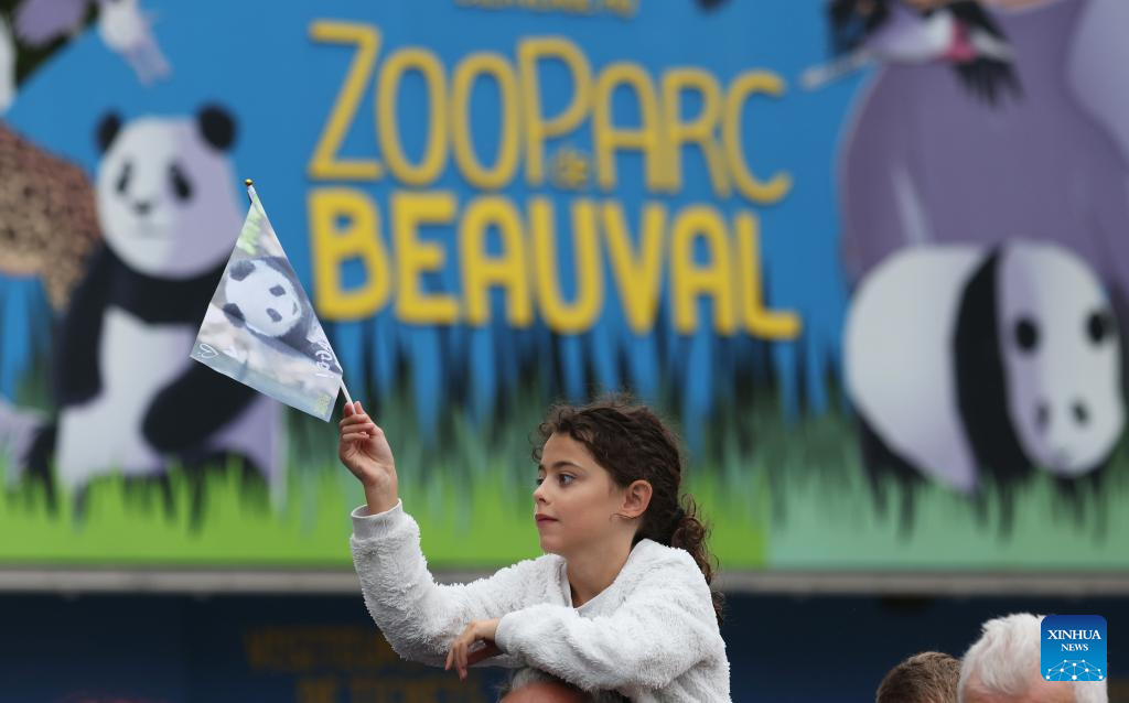 A girl waits to bid farewell to giant panda Yuan Meng in front of the Beauval Zoo in Saint-Aignan, France, July 25, 2023. First giant panda born in France Yuan Meng settled into a customized cage filled with bamboo, starting his journey to China's Chengdu Research Base of Giant Panda Breeding Tuesday after a long-haul departure from Paris. (Xinhua/Gao Jing)