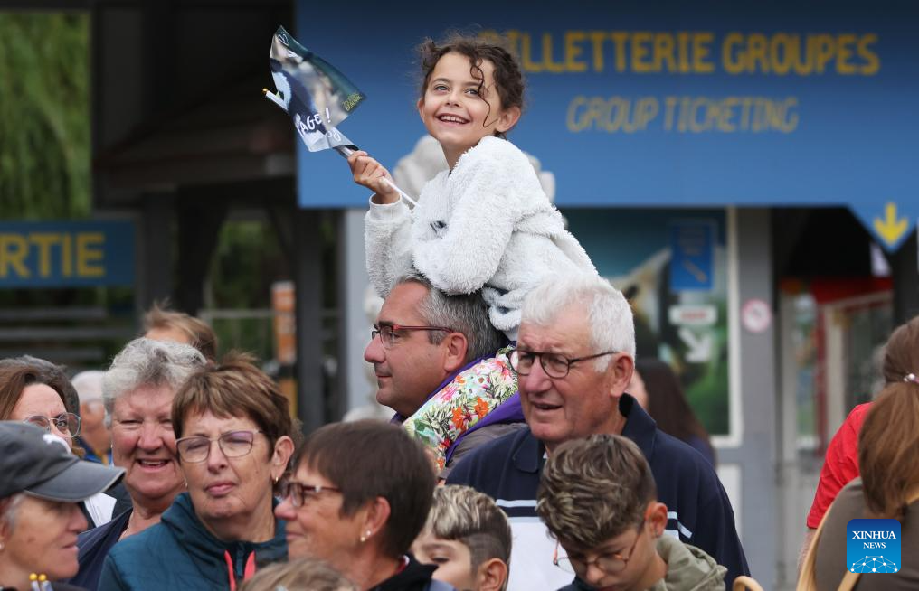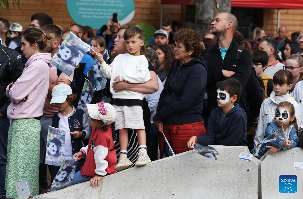 People wait to bid farewell to giant panda Yuan Meng in front of the Beauval Zoo in Saint-Aignan, France, July 25, 2023. First giant panda born in France Yuan Meng settled into a customized cage filled with bamboo, starting his journey to China's Chengdu Research Base of Giant Panda Breeding Tuesday after a long-haul departure from Paris. (Xinhua/Gao Jing)