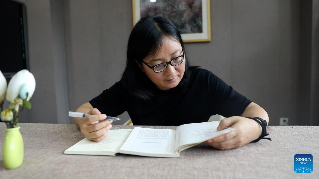 Chen Ying, an Italian language professor with the College of Western Languages and Cultures, Sichuan International Studies University (SISU), reads a book in southwest China's Chongqing Municipality, June 29, 2023. (Xinhua/Hao Yilin)