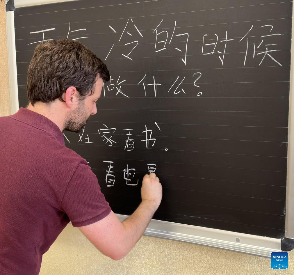 Giovanni Goffredo, a Chinese language teacher, writes Chinese sentences on a blackboard in a Chinese language classroom in Milan, Italy, July 3, 2023. (Xinhua/Guo Wendi)