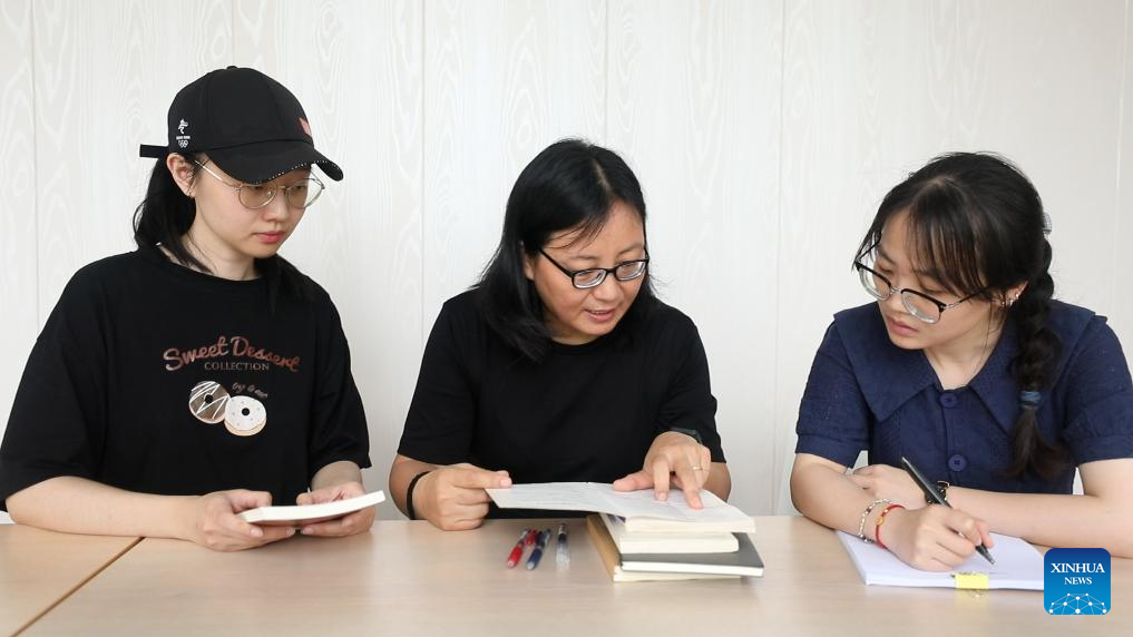 Chen Ying (C), an Italian language professor with the College of Western Languages and Cultures, Sichuan International Studies University (SISU), talks with her students in southwest China's Chongqing Municipality, June 29, 2023. (Xinhua/Hao Yilin)