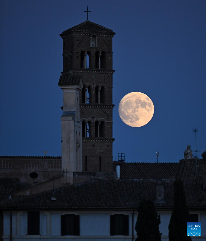 People watch the moon rising over Rome, Italy, on July 31, 2023. (Photo by Alberto Lingria/Xinhua)