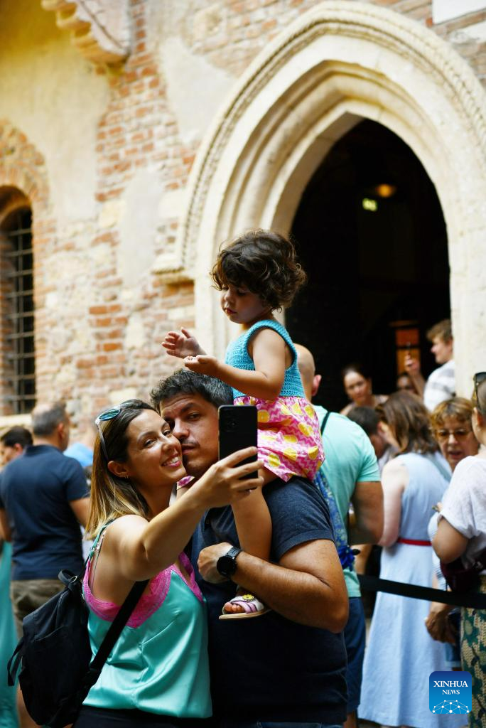 Tourists take a selfie at Juliet's house in Verona, Italy, on Aug. 2, 2023. Verona is located in north Italy's Veneto. As one of the main tourist destinations in north Italy, the city has artistic heritages, annual fairs, shows, and operas. It was listed as a UNESCO world heritage site in 2000 for its historical buildings. (Xinhua/Jin Mamengni)