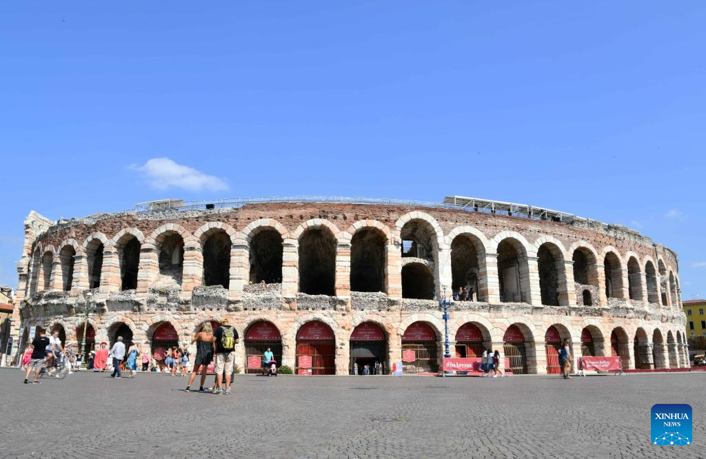Tourists visit the Arena di Verona in Verona, Italy, on Aug. 2, 2023. Verona is located in north Italy's Veneto. As one of the main tourist destinations in north Italy, the city has artistic heritages, annual fairs, shows, and operas. It was listed as a UNESCO world heritage site in 2000 for its historical buildings. (Xinhua/Jin Mamengni)