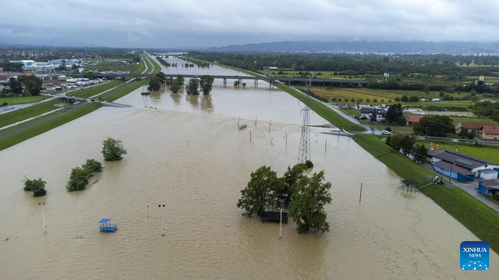 This photo taken on Aug. 5, 2023 shows a view of floods caused by Sava River overflow at Javorje near Zagreb, Croatia. (Igor Soban/PIXSELL via Xinhua)