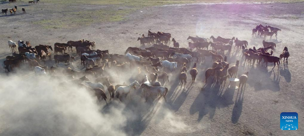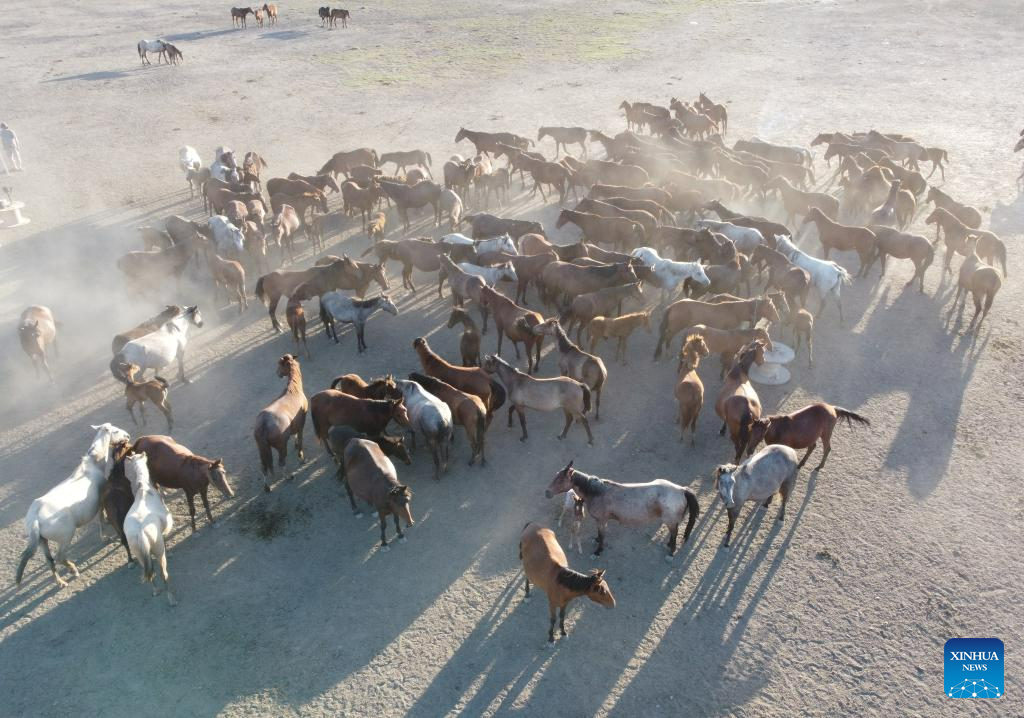 This aerial photo taken on Aug. 5, 2023 shows a herd of wild horses at Sultan Reedy National Park in Kayseri, Türkiye. The park is located around Lake Yay in Kayseri Province, central Türkiye. (Mustafa Kaya/Handout via Xinhua)