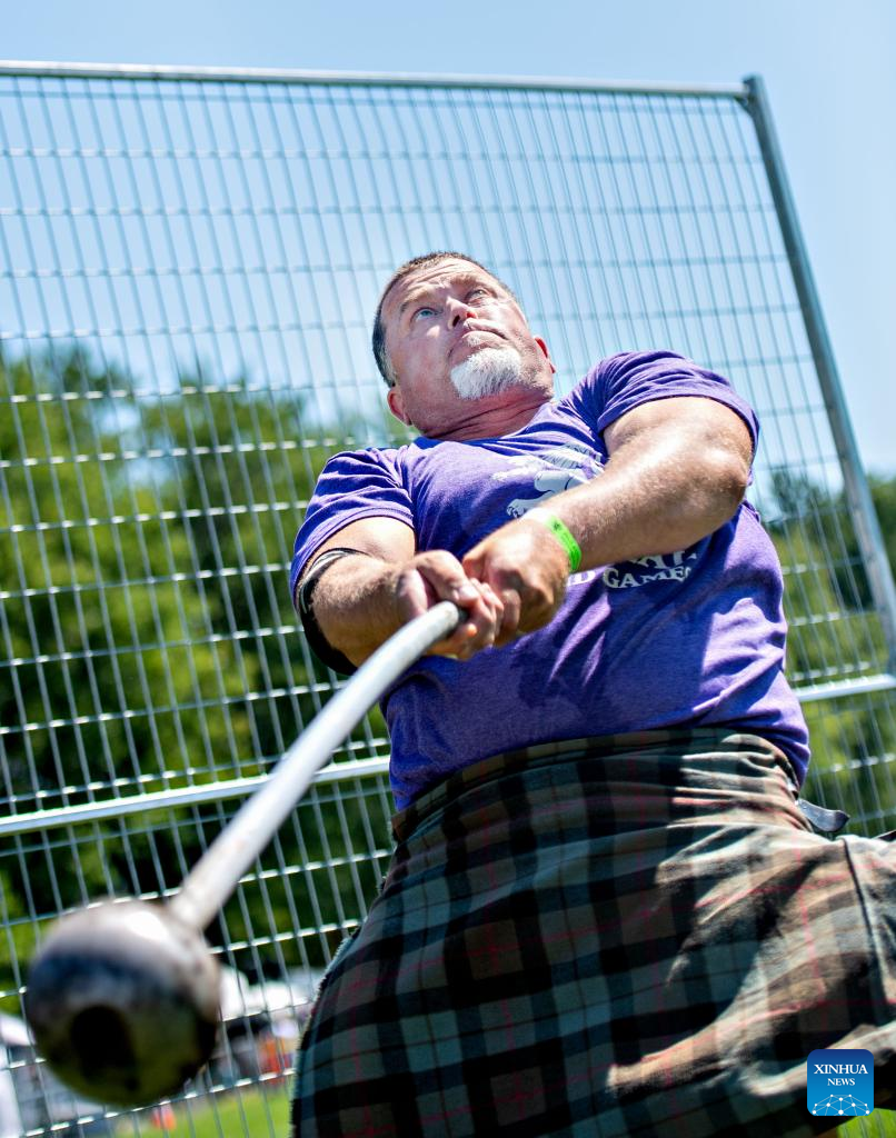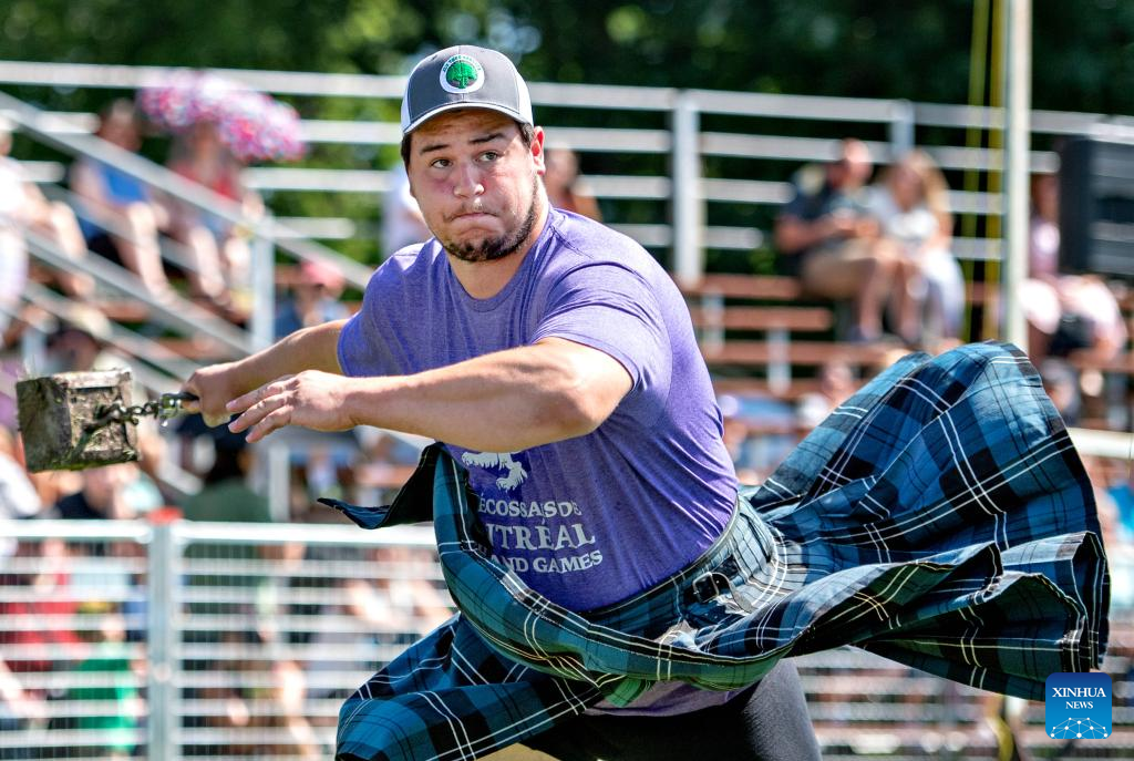 A man takes part in a toss competition during the 2023 Montreal Highland Games in Montreal, Canada, on Aug. 6, 2023. The 2023 Montreal Highland Games were held here Sunday. The games, held annually during summers since 1855, feature traditional Scottish events that include pipe bands, athletes and Highland dancers. (Photo by Andrew Soong/Xinhua)