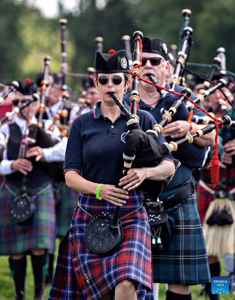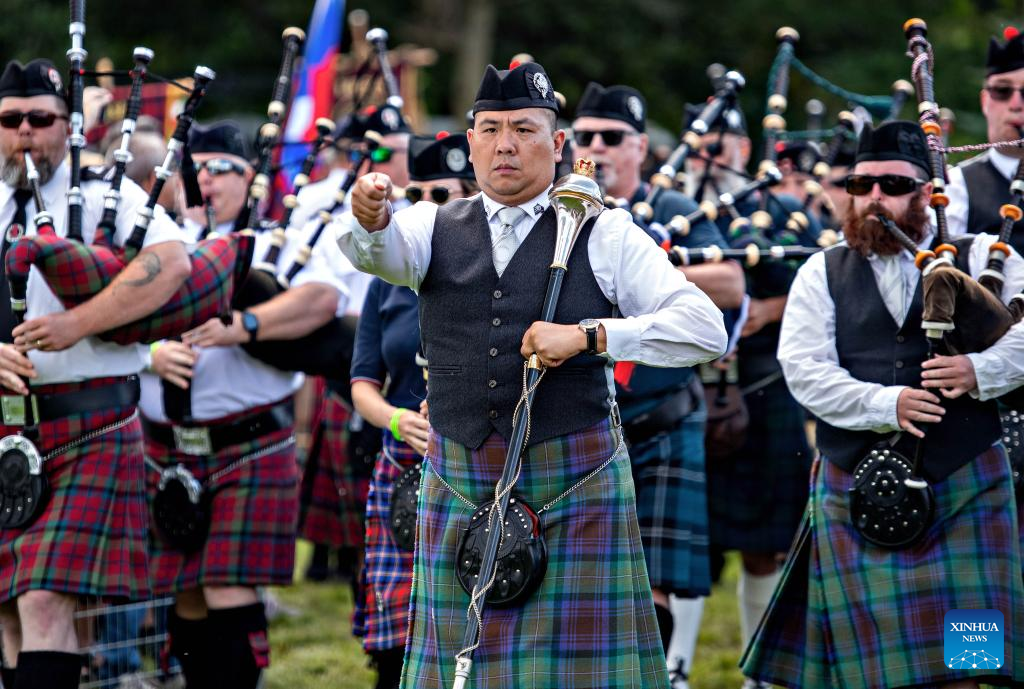 People play traditional musical instruments during the 2023 Montreal Highland Games in Montreal, Canada, on Aug. 6, 2023. The 2023 Montreal Highland Games were held here Sunday. The games, held annually during summers since 1855, feature traditional Scottish events that include pipe bands, athletes and Highland dancers. (Photo by Andrew Soong/Xinhua)