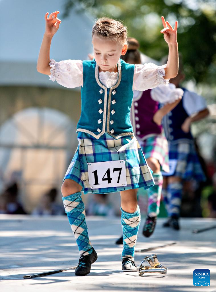 A kid performs during a traditional Highland dance competition at the 2023 Montreal Highland Games in Montreal, Canada, on Aug. 6, 2023. The 2023 Montreal Highland Games were held here Sunday. The games, held annually during summers since 1855, feature traditional Scottish events that include pipe bands, athletes and Highland dancers. (Photo by Andrew Soong/Xinhua)