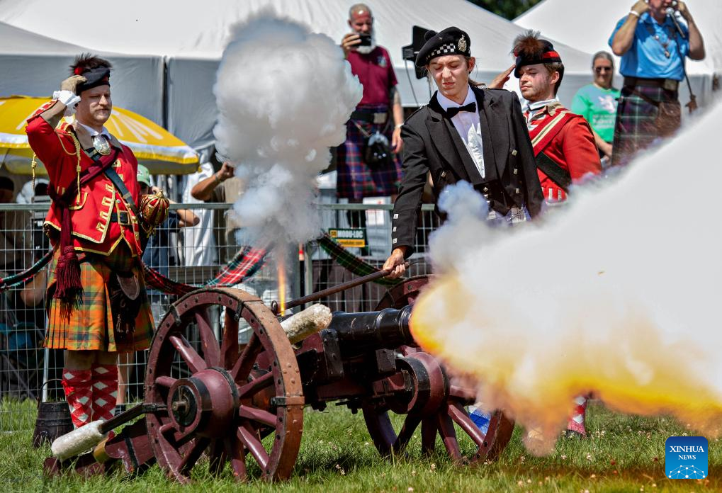 People fire a traditional cannon during the 2023 Montreal Highland Games in Montreal, Canada, on Aug. 6, 2023. The 2023 Montreal Highland Games were held here Sunday. The games, held annually during summers since 1855, feature traditional Scottish events that include pipe bands, athletes and Highland dancers. (Photo by Andrew Soong/Xinhua)