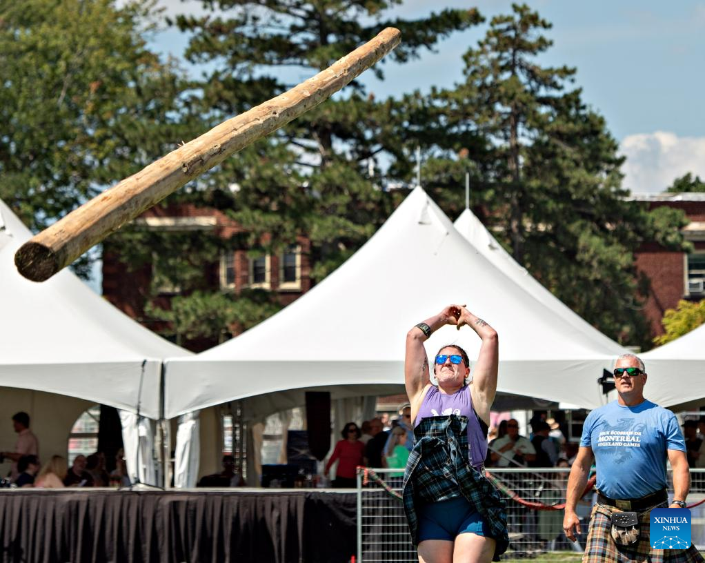 People take part in a toss competition during the 2023 Montreal Highland Games in Montreal, Canada, on Aug. 6, 2023. The 2023 Montreal Highland Games were held here Sunday. The games, held annually during summers since 1855, feature traditional Scottish events that include pipe bands, athletes and Highland dancers. (Photo by Andrew Soong/Xinhua)