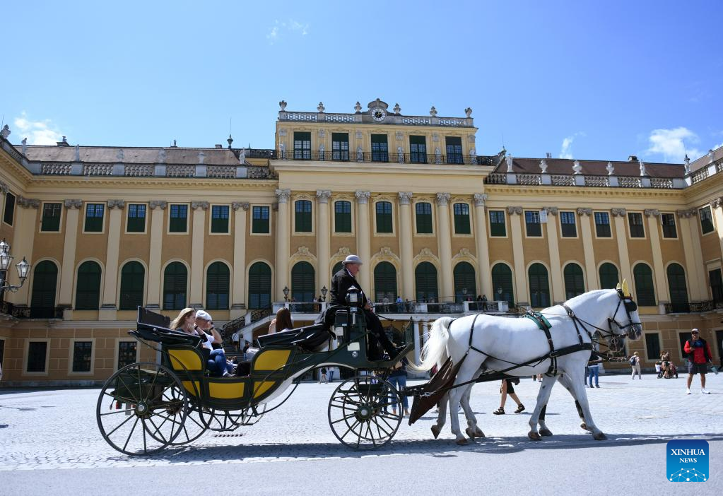 Tourists take a horse carriage in front of Schonbrunn in Vienna, Austria, on Aug. 8, 2023. (Xinhua/He Canling)