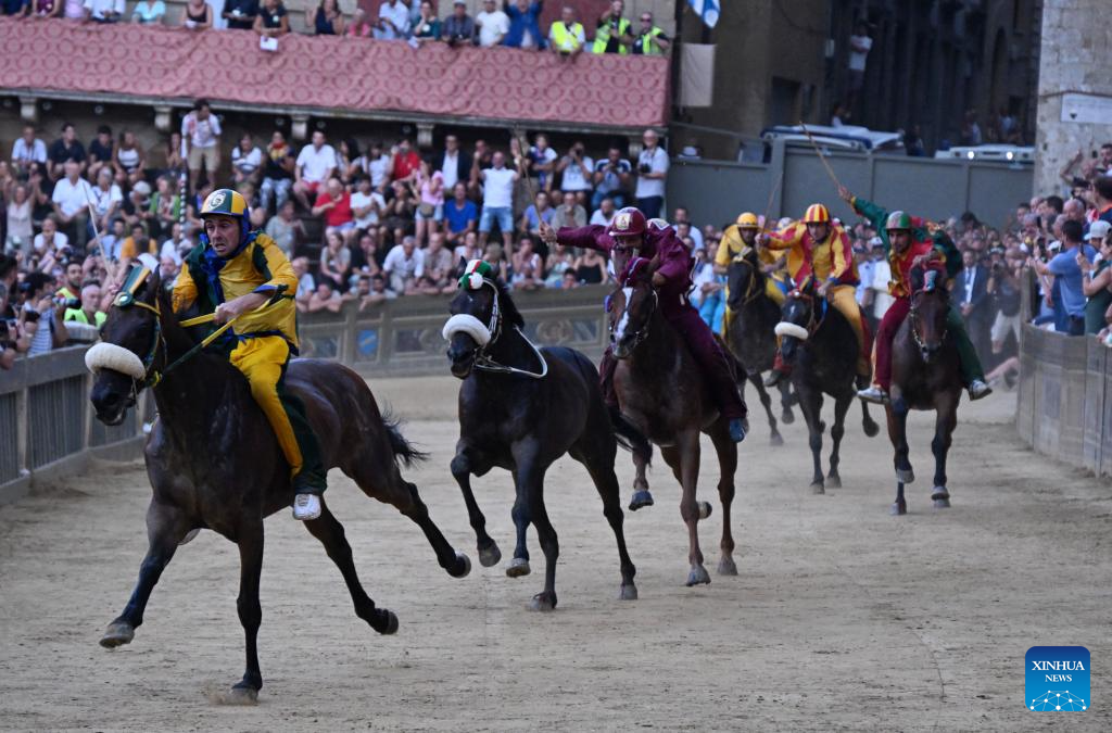 Jockeys ride their horses during the Palio in Siena, Italy, on Aug.16, 2023. Palio in Siena, or "Palio di Siena" in Italian, is a historical horse race held twice a year in Siena since 1656. (Photo by Alberto Lingria/Xinhua)