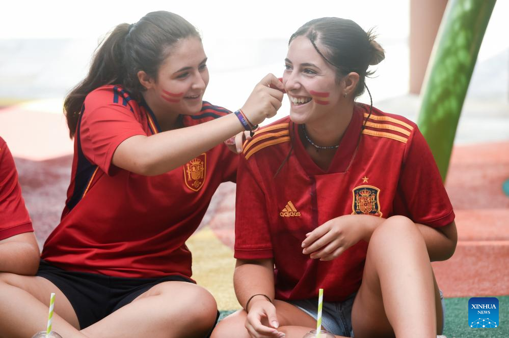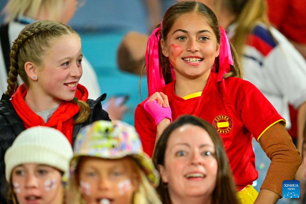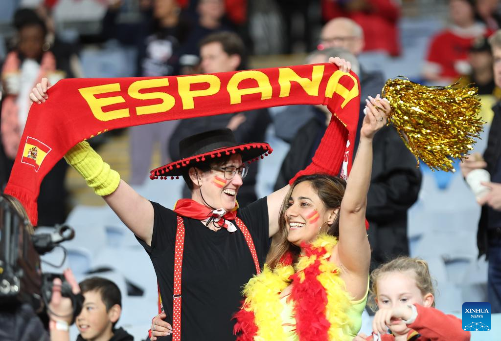 Fans cheer for team Spain prior to the final match between Spain and England at the 2023 FIFA Women's World Cup in Sydney, Australia, Aug. 20, 2023. (Xinhua/Zhu Wei)