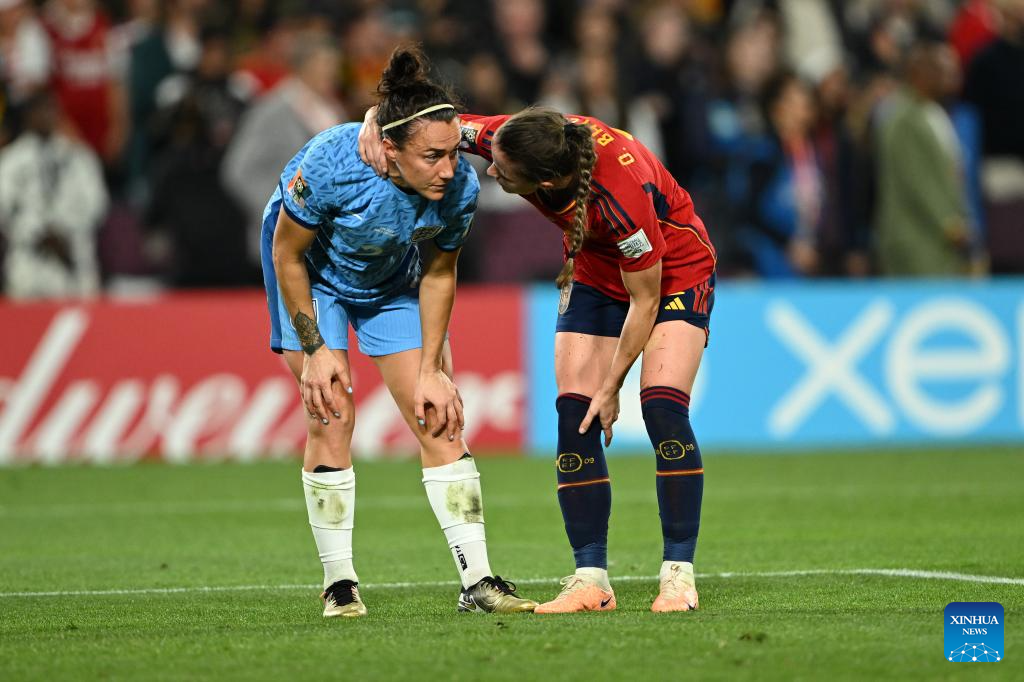 England's Lucy Bronze (L) talks with Spain's Ona Batlle after the Final between Spain and England at the 2023 FIFA Women's World Cup in Sydney, Australia, Aug. 20, 2023. (Xinhua/Li Yibo)