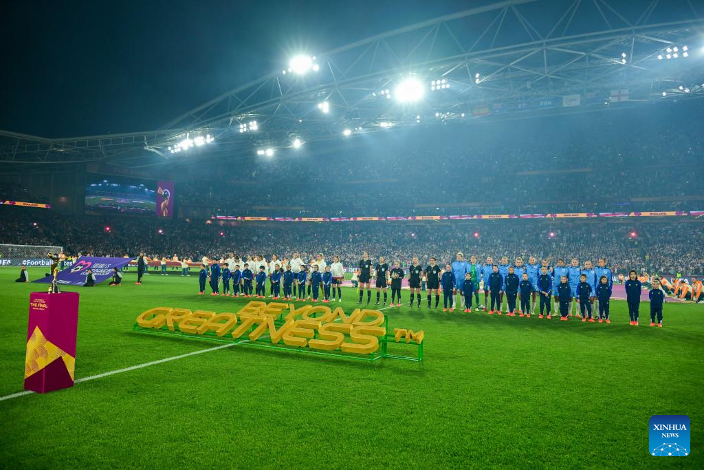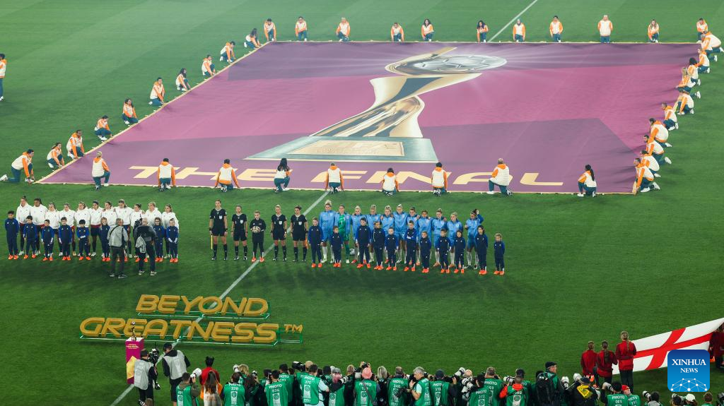 Players line up prior to the Final between Spain and England at the 2023 FIFA Women's World Cup in Sydney, Australia, Aug. 20, 2023. (Xinhua/Bai Xuefei)