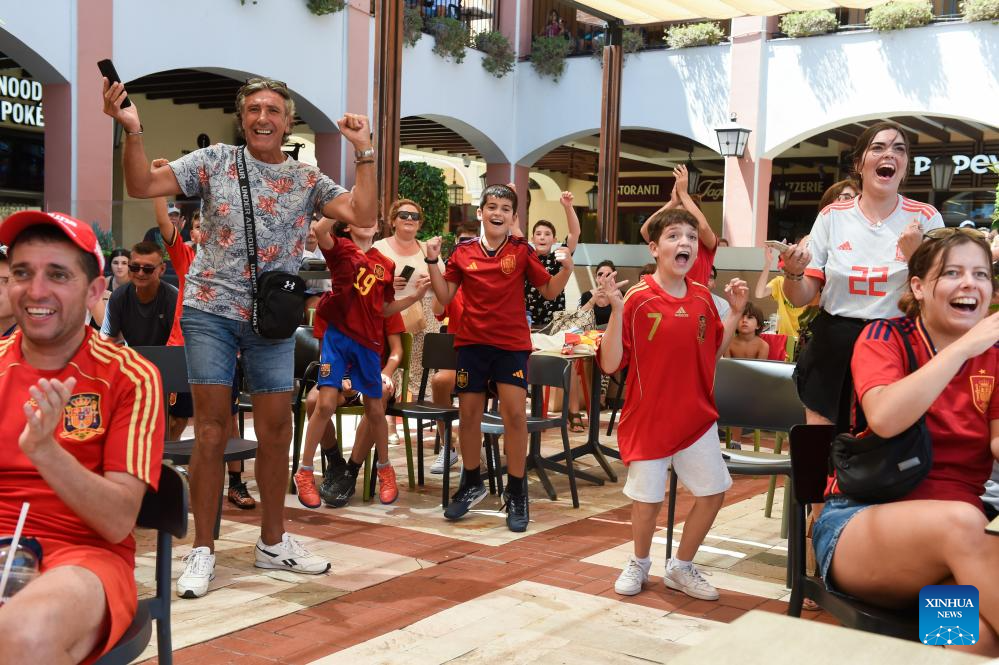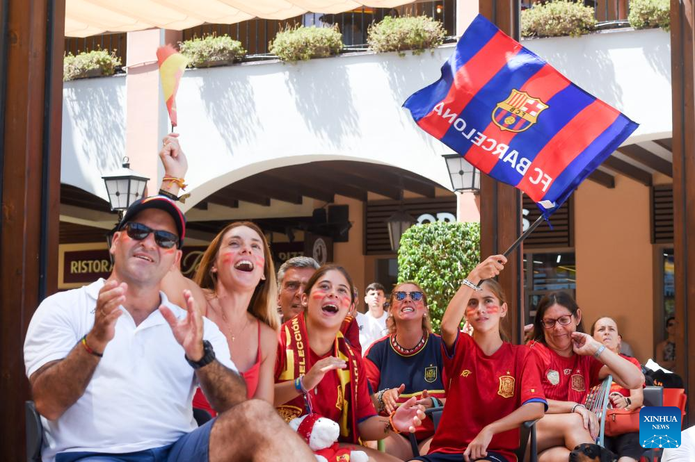 Fans celebrate after Spain winning the Final against England at the 2023 FIFA Women's World Cup in Malaga, Spain, Aug. 20, 2023. (Photo by Gustavo Valiente/Xinhua)