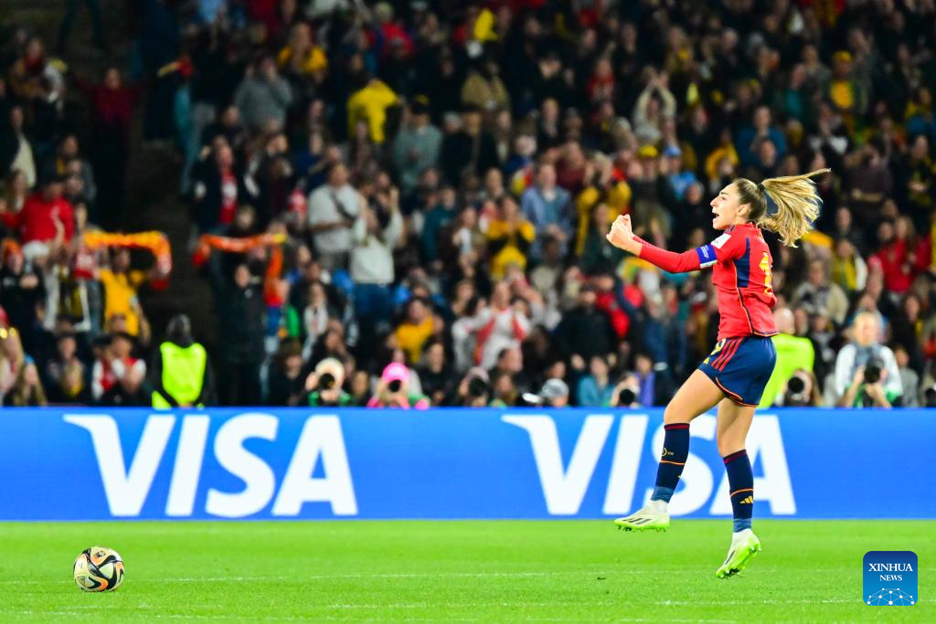 Spain's Olga Carmona celebrates scoring during the Final between Spain and England at the 2023 FIFA Women's World Cup in Sydney, Australia, Aug. 20, 2023. (Xinhua/Zhu Wei)