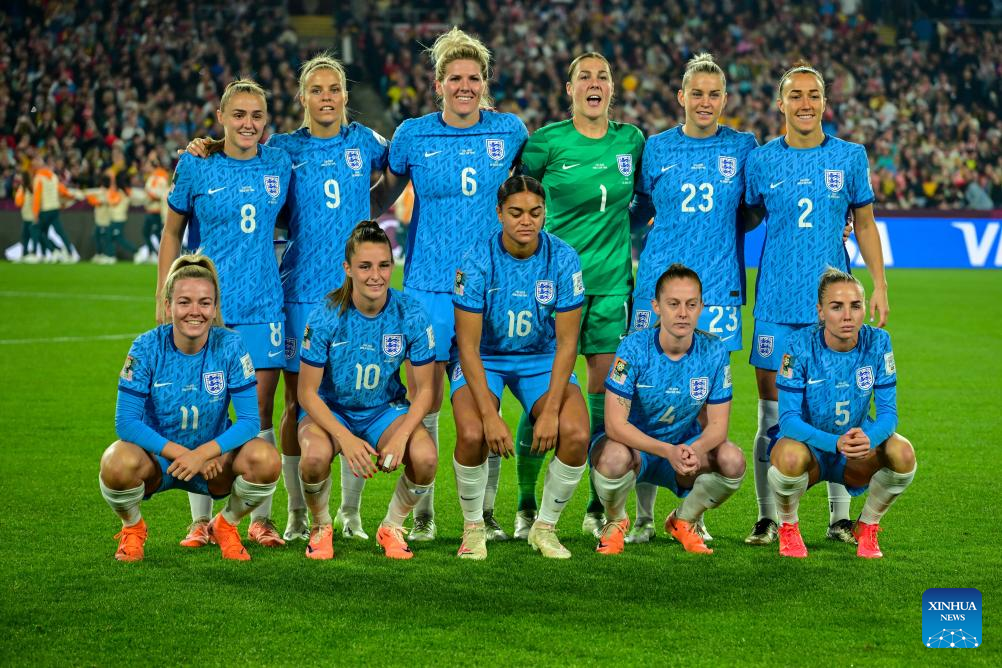 Starting players of England pose for photos prior to the Final between Spain and England at the 2023 FIFA Women's World Cup in Sydney, Australia, Aug. 20, 2023. (Xinhua/Zhu Wei)