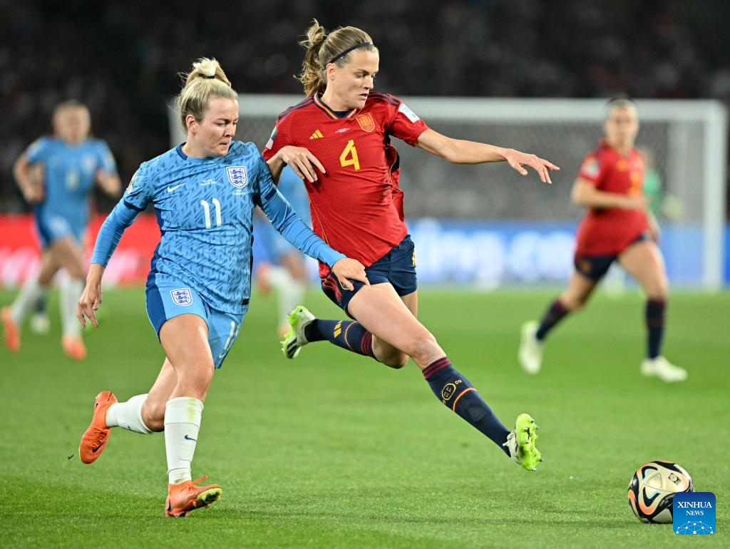 Spain's Irene Paredes (R) vies with England's Lauren Hemp during the Final between Spain and England at the 2023 FIFA Women's World Cup in Sydney, Australia, Aug. 20, 2023. (Xinhua/Guo Lei)