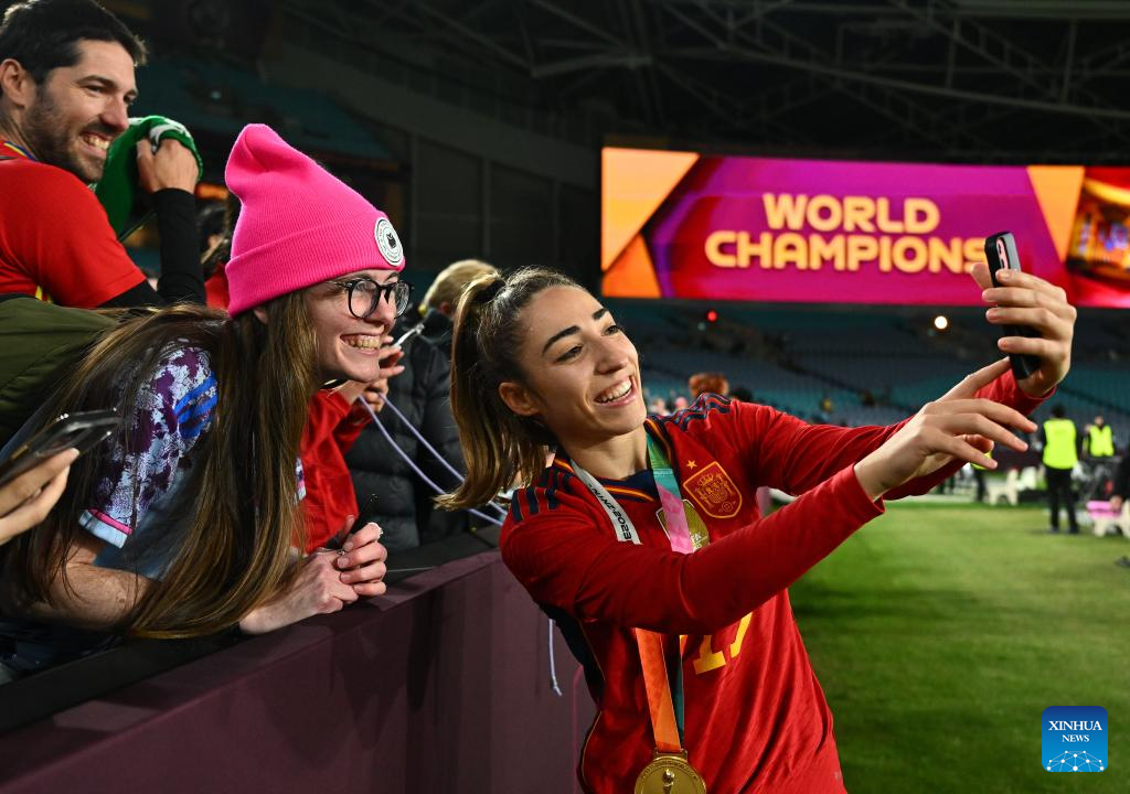 Players of Spain celebrate after the awarding ceremony of the 2023 FIFA Women's World Cup in Sydney, Australia, Aug. 20, 2023. (Xinhua/Bai Xuefei)