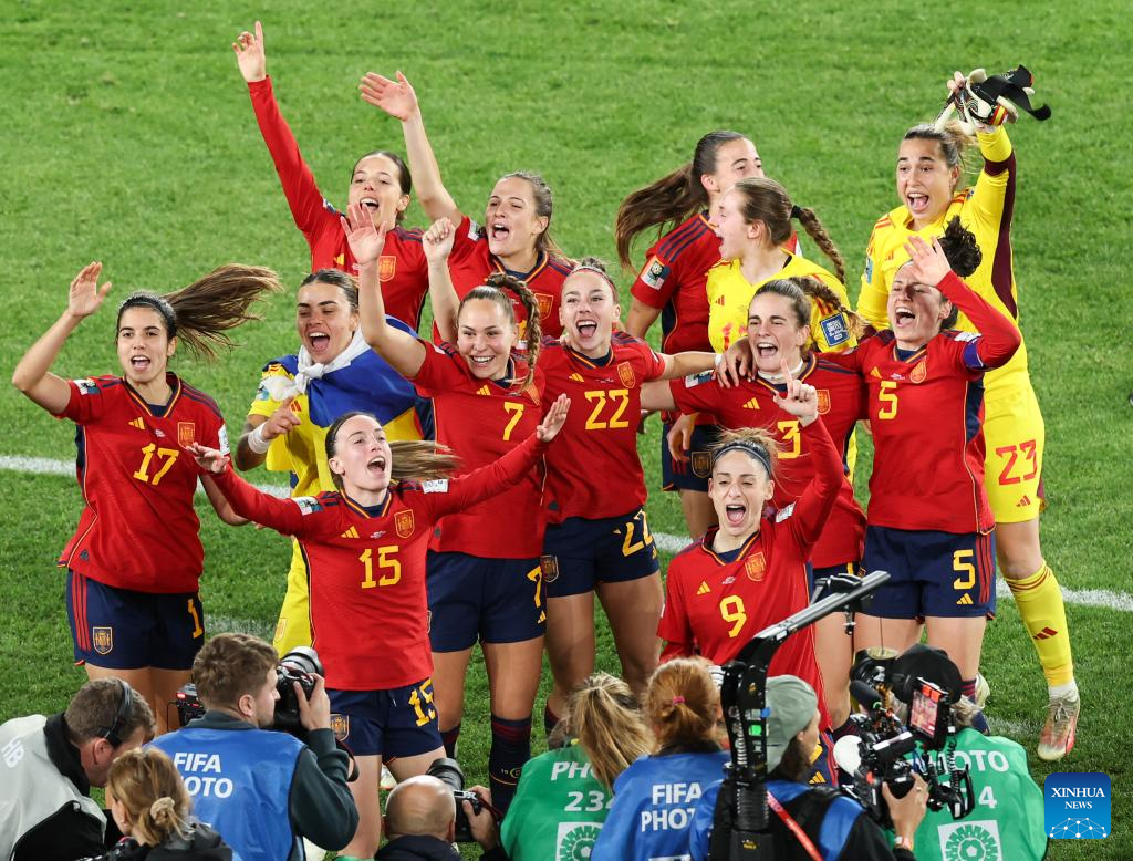 Players of Spain celebrate after winning the Final between Spain and England at the 2023 FIFA Women's World Cup in Sydney, Australia, Aug. 20, 2023. (Xinhua/Ding Ting)