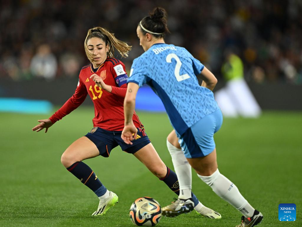 Spain's Olga Carmona (L) vies with England's Lucy Bronze during the Final between Spain and England at the 2023 FIFA Women's World Cup in Sydney, Australia, Aug. 20, 2023. (Xinhua/Li Yibo)