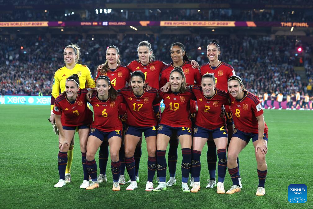 Starting players of Spain pose for photos prior to the Final between Spain and England at the 2023 FIFA Women's World Cup in Sydney, Australia, Aug. 20, 2023. (Xinhua/Ding Xu)