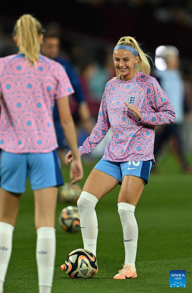 England's Chloe Kelly warms up before the final match between Spain and England at the 2023 FIFA Women's World Cup in Sydney, Australia, Aug. 20, 2023. (Xinhua/Li Yibo)