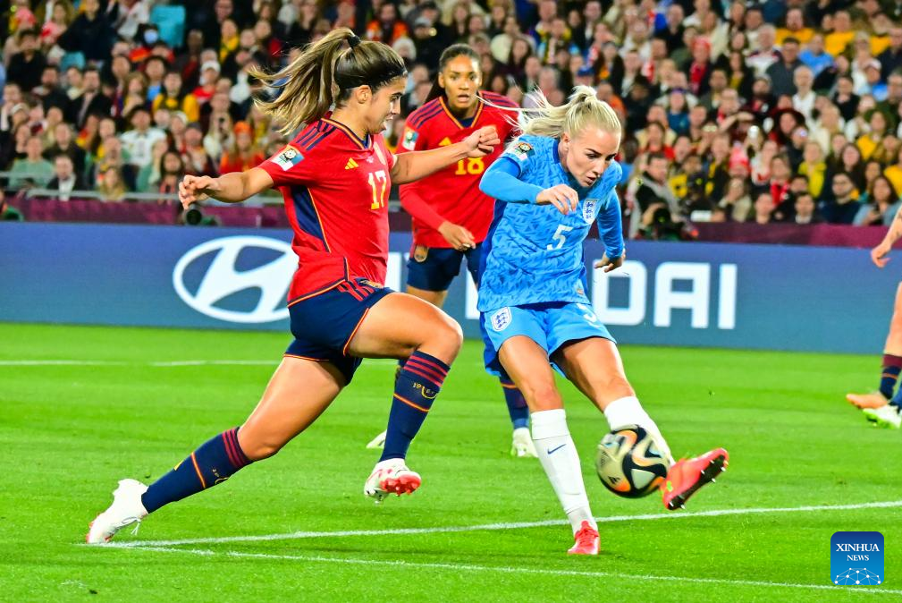 England's Alex Greenwood (R) vies with Spain's Alba Redondo during the Final between Spain and England at the 2023 FIFA Women's World Cup in Sydney, Australia, Aug. 20, 2023. (Xinhua/Zhu Wei)