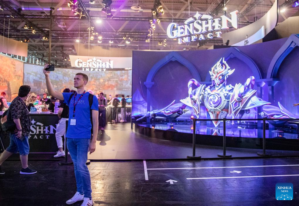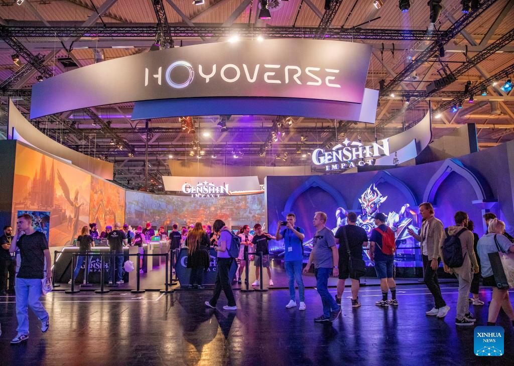 People visit the booth of miHoYo during gamescom 2023 in Cologne, Germany, Aug. 23, 2023. The 2023 edition of the international computer and video games trade fair gamescom opened on Wednesday in Cologne, western Germany. Chinese companies displayed their products on the trade fair.