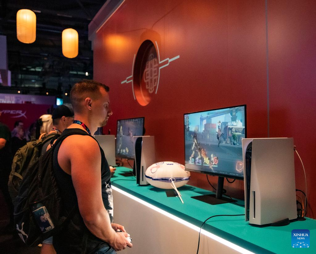 People try games at the booth of miHoYo during gamescom 2023 in Cologne, Germany, Aug. 23, 2023. The 2023 edition of the international computer and video games trade fair gamescom opened on Wednesday in Cologne, western Germany. Chinese companies displayed their products on the trade fair.