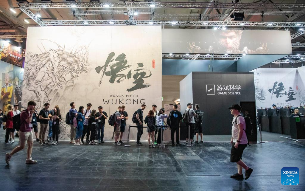 People try games at the booth of game science during gamescom 2023 in Cologne, Germany, Aug. 23, 2023. The 2023 edition of the international computer and video games trade fair gamescom opened on Wednesday in Cologne, western Germany. Chinese companies displayed their products on the trade fair.