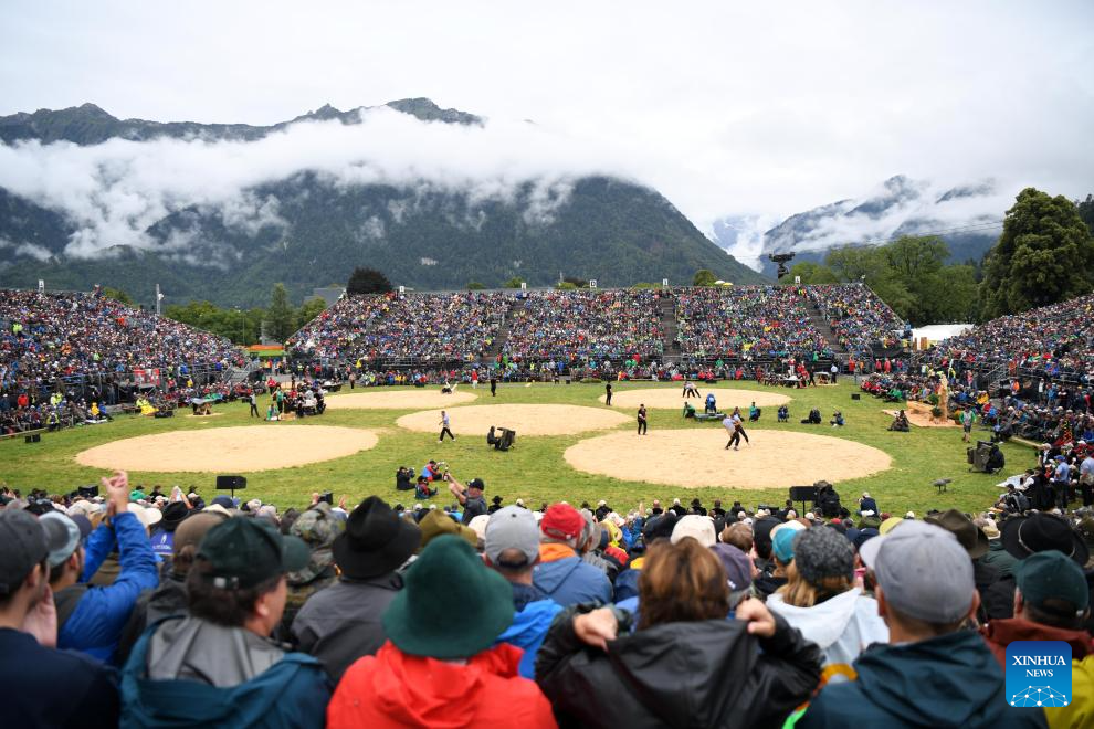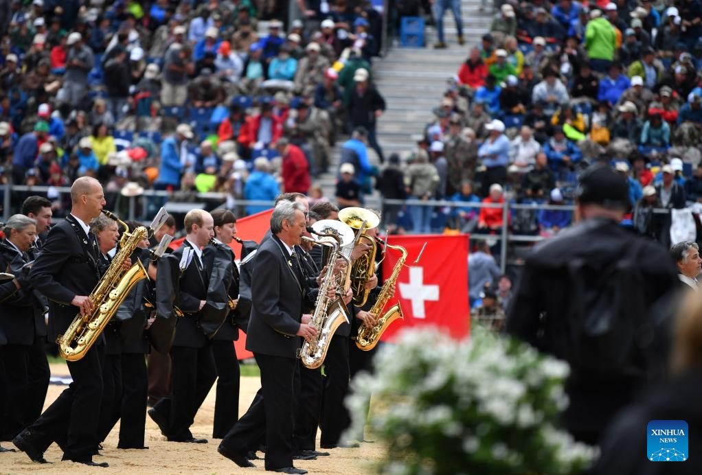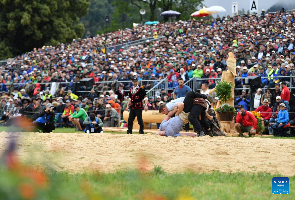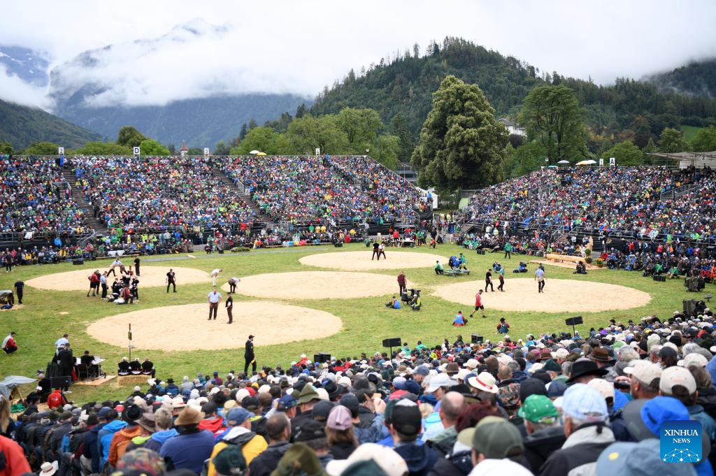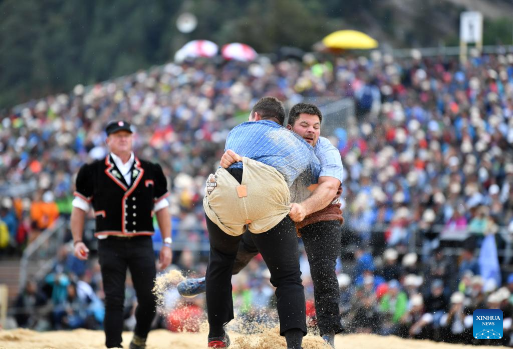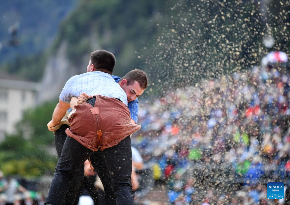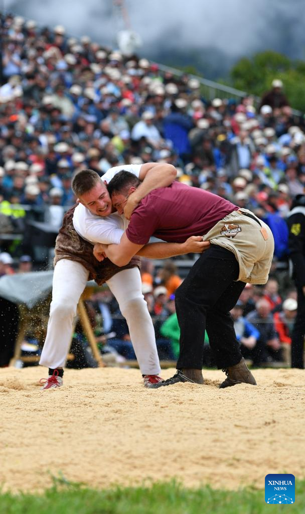 Wrestlers compete during the 2023 Unspunnen Festival in Interlaken, Switzerland, Aug. 27, 2023. (Xinhua/Lian Yi)
