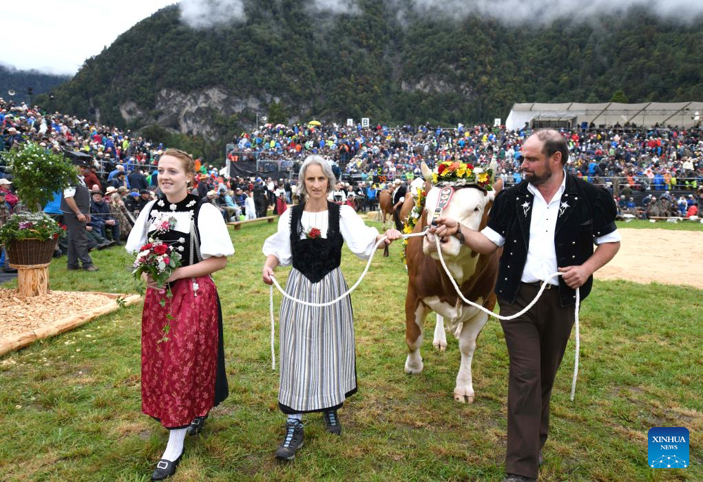 People dressed in traditional costumes parade during the 2023 Unspunnen Festival in Interlaken, Switzerland, Aug. 27, 2023. (Xinhua/Lian Yi)