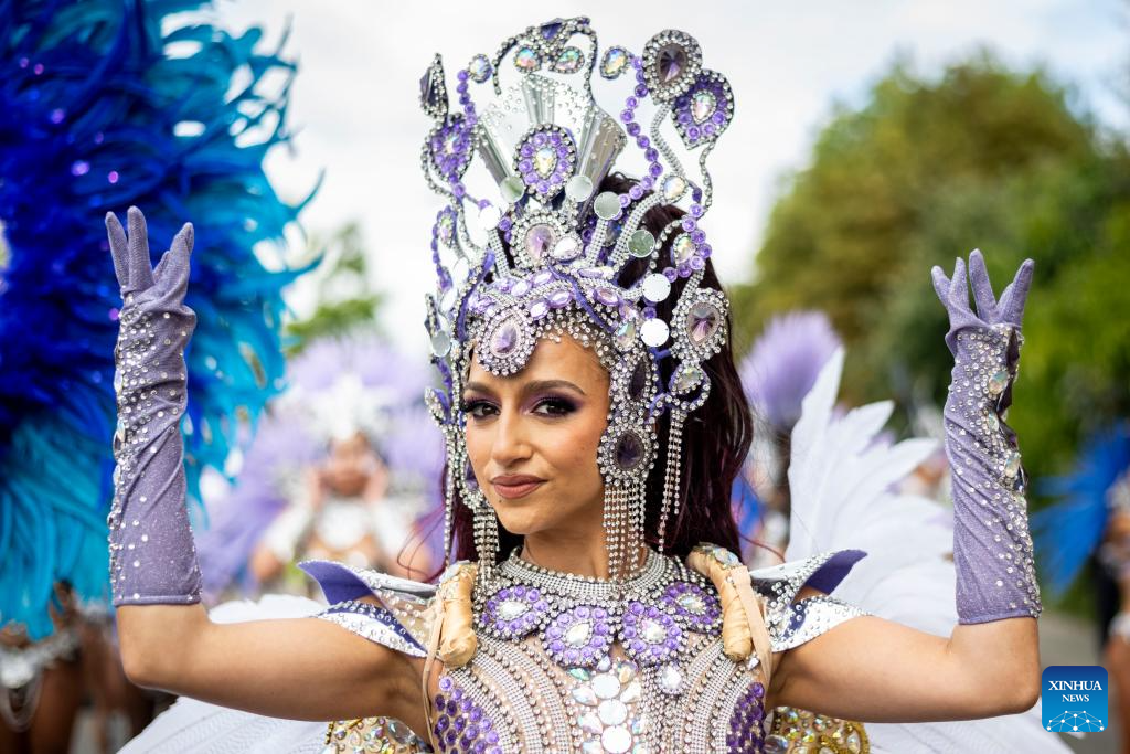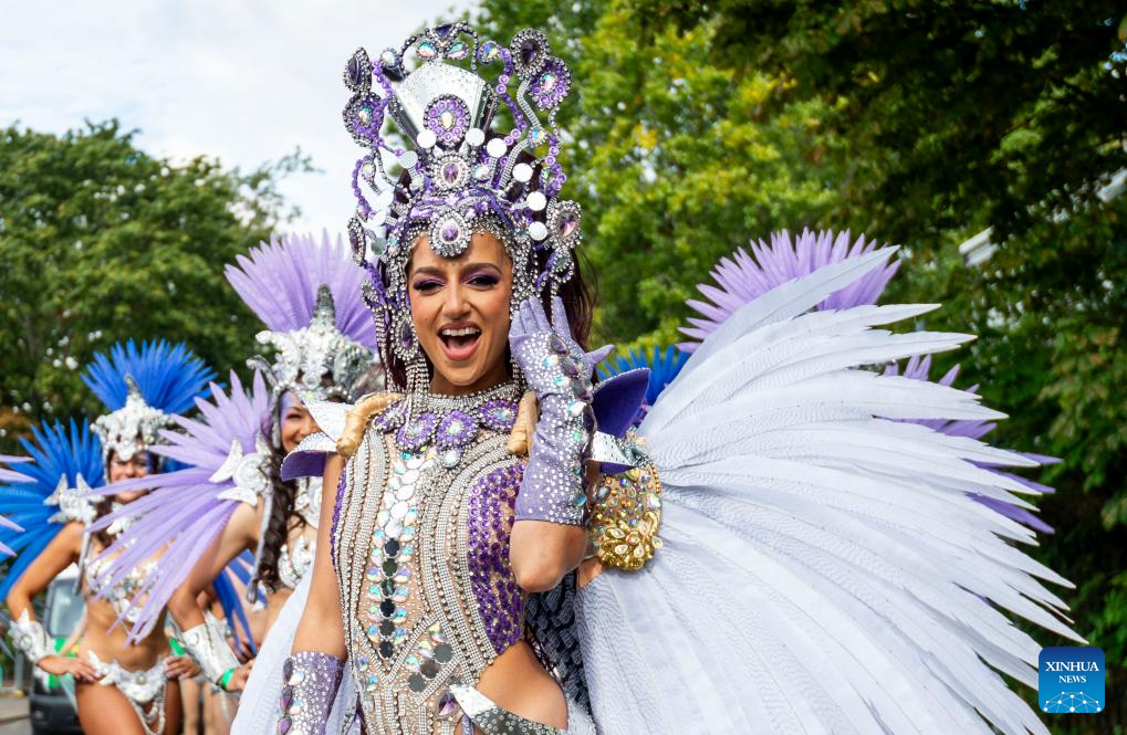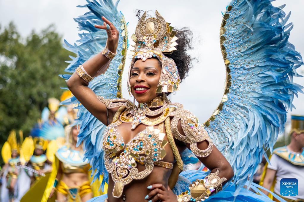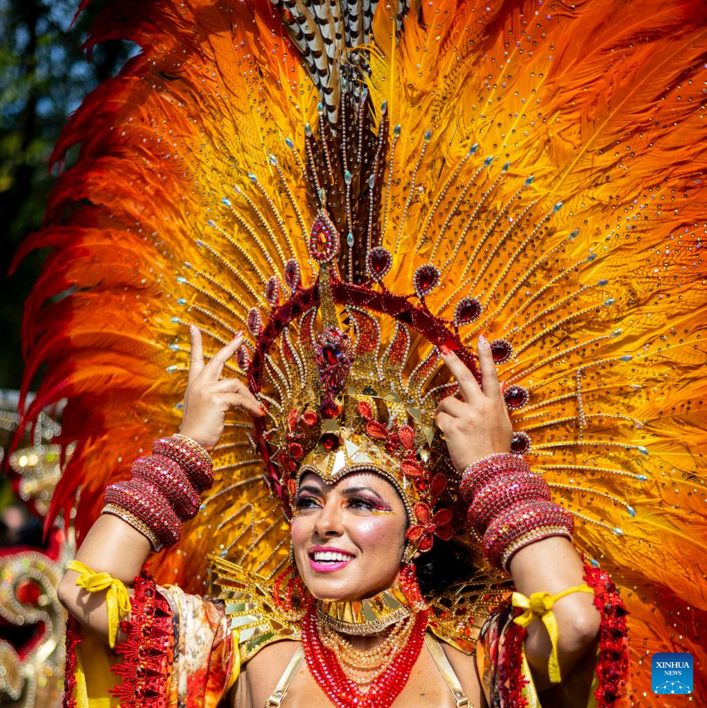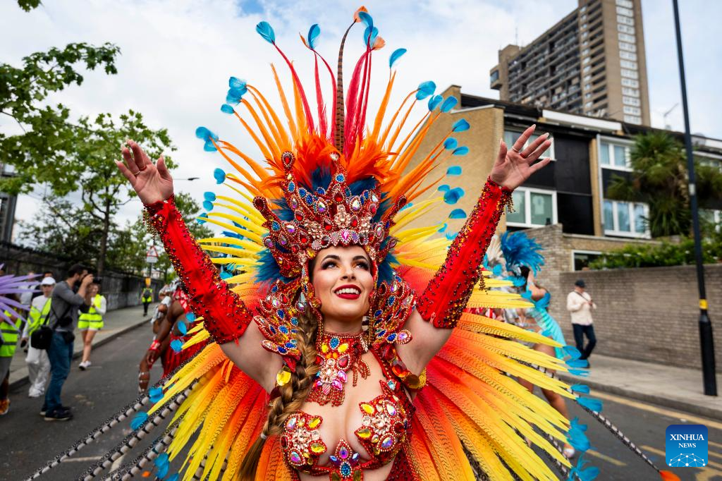 A performer participates in Notting Hill Carnival in London, Britain, on Aug. 28, 2023. Originated in the 1960s, the carnival is a way for Afro-Caribbean communities to celebrate their cultures and traditions. (Photo by Stephen Chung/Xinhua)